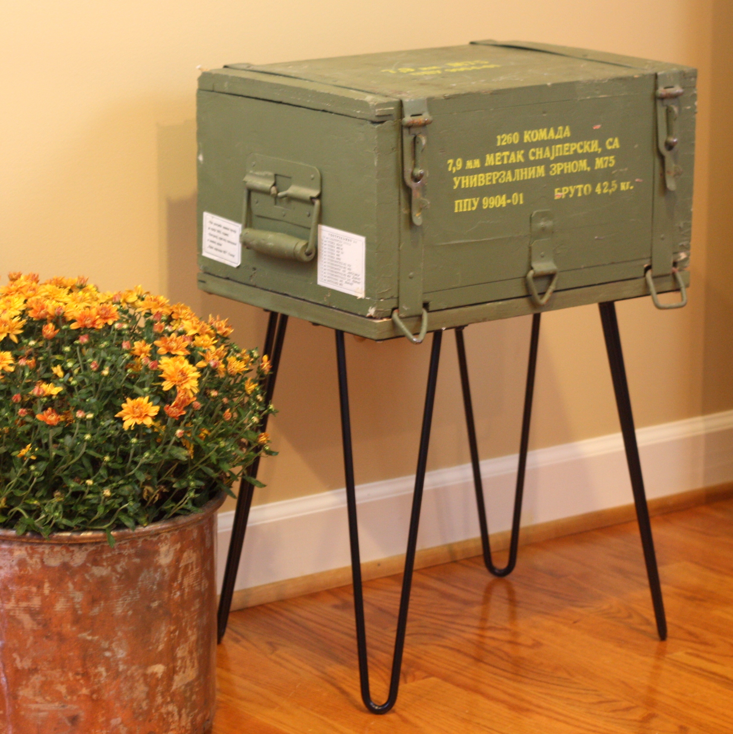 This crate’s original use was to ship ammunition for a collectible WWII gun. I loved its army green color and the cool Yugoslavian writing on the sides. This piece was too interesting to hide in our basement, so I repurposed it into a table.