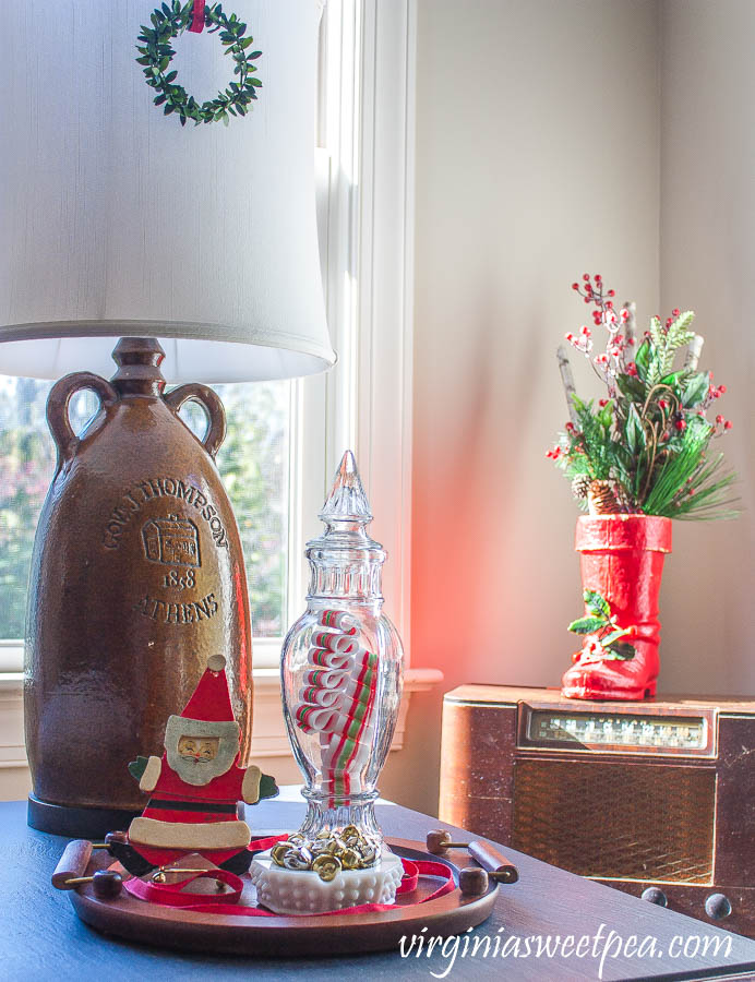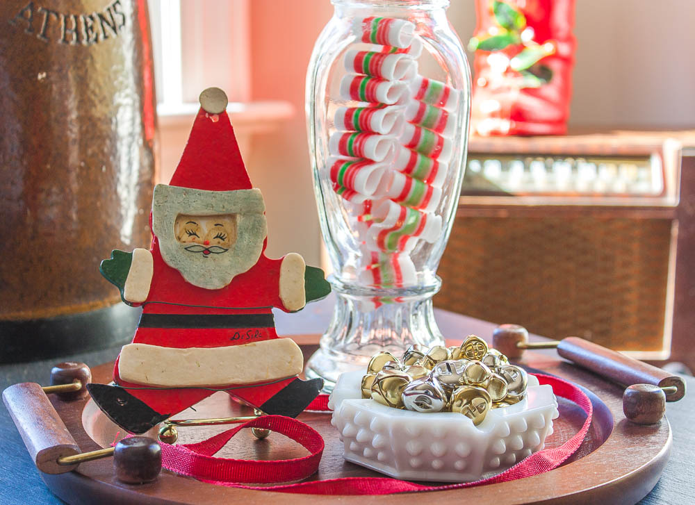 A Christmas vignette on my grandmother’s tray includes a vintage jar filled with ribbon candy, a milk glass ashtray filled with jingle bells, and a Santa ornament from 1970 that was my brother’s first ornament.