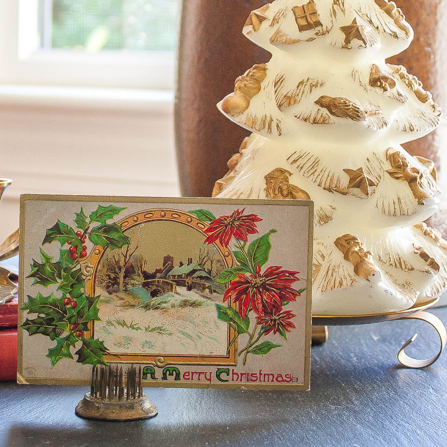 The other end table holds another vintage Christmas vignette. Both of the tree candles belonged to my late mother-in-law and my father-in-law passed them on to me last Christmas.