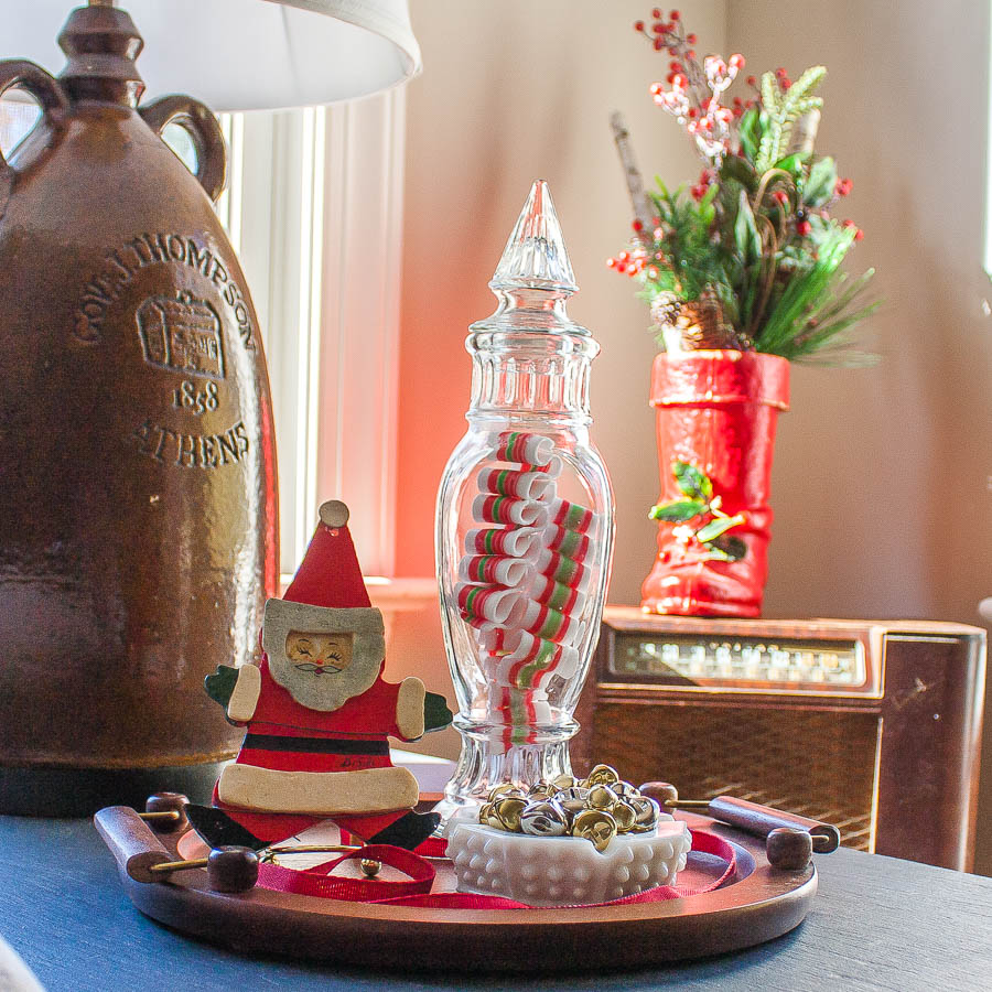 A Christmas vignette on my grandmother’s tray includes a vintage jar filled with ribbon candy, a milk glass ashtray filled with jingle bells, and a Santa ornament from 1970 that was my brother’s first ornament.Christmas vignette with an antique Santa boot, vintage candy jar, 1970 Santa ornament, and a hobnob milk glass candy dish filled with jingle bells.