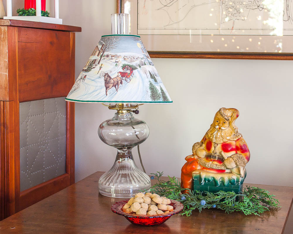 In the late 90’s my mom and I bought paper shades like this one for different holidays.  The shade has tiny holes and when the lamp is on, the sky and houses light up.Antique lamp with a Christmas lamp shade with holes that illuminate the scene on it, vintage Santa bank, and a reindeer bowl filled with dog treats