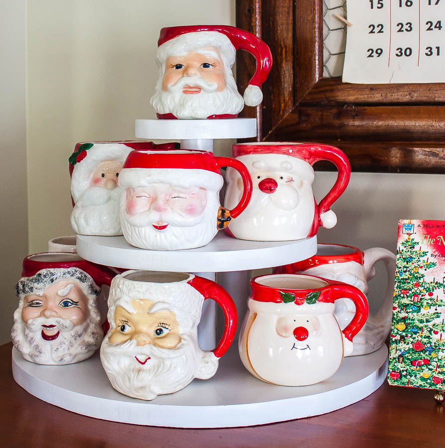 A few years ago my mom’s friend passed along her Santa mug collection to me.  I displayed them on a DIY cupcake stand that my husband helped me make a few years ago.