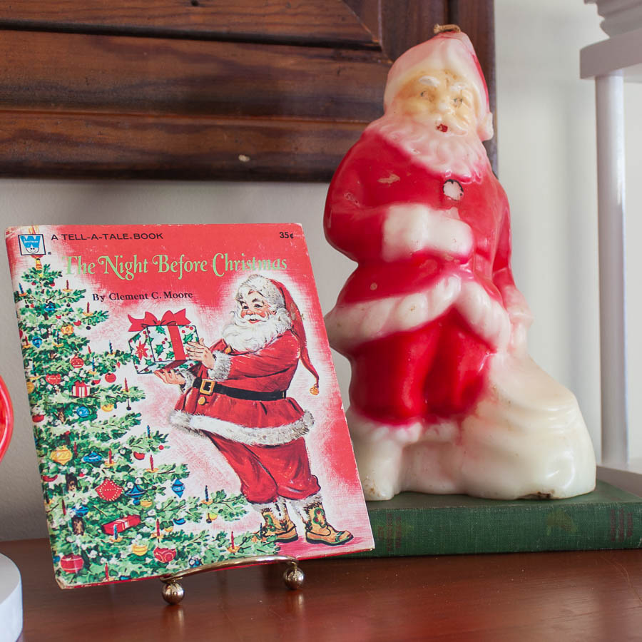 Santa Mug CollectionThe Night Before Christmas book was a gift from Mrs. Carter, my first grade teacher, in 1976.  The vintage Santa candle was a vintage find from a few years ago.  The white lantern was another DIY project.1976 The Night Before Christmas Book and a vintage Santa candle