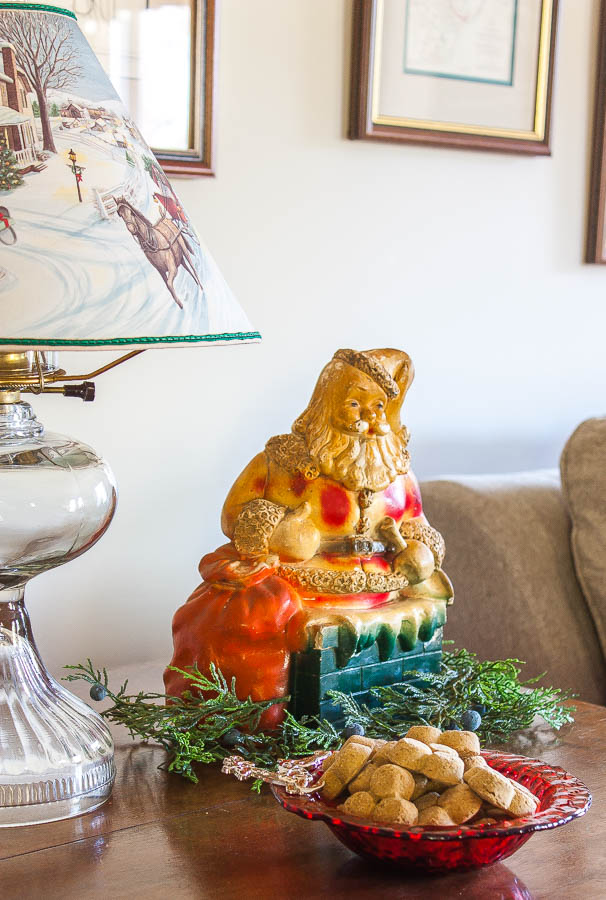 A bowl of treats for Sherman is always on this table.  He is a really good dog and never steals treats, he only eats a treat if we give him one.Antique lamp with a Christmas lamp shade with holes that illuminate the scene on it, vintage Santa bank, and a reindeer bowl filled with dog treats