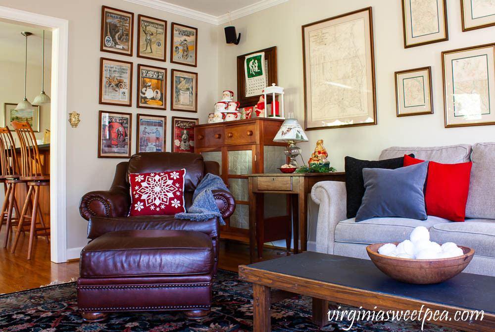 Each evening my husband and I each watch tv from a sofa and Sherman, our beloved rescue dog, claims the leather chair.Family Room Decorated for Christmas with Vintage