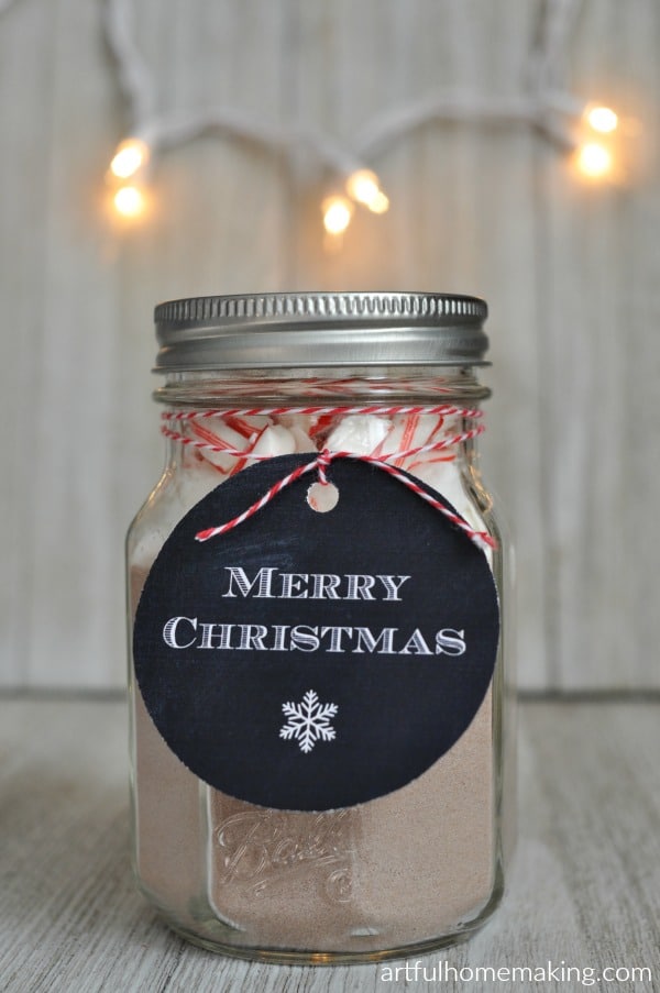 Artful Homemaking shared Peppermint Hot Cocoa Gift Jars with a free printable label. This would be a great gift for neighbors or co-workers.