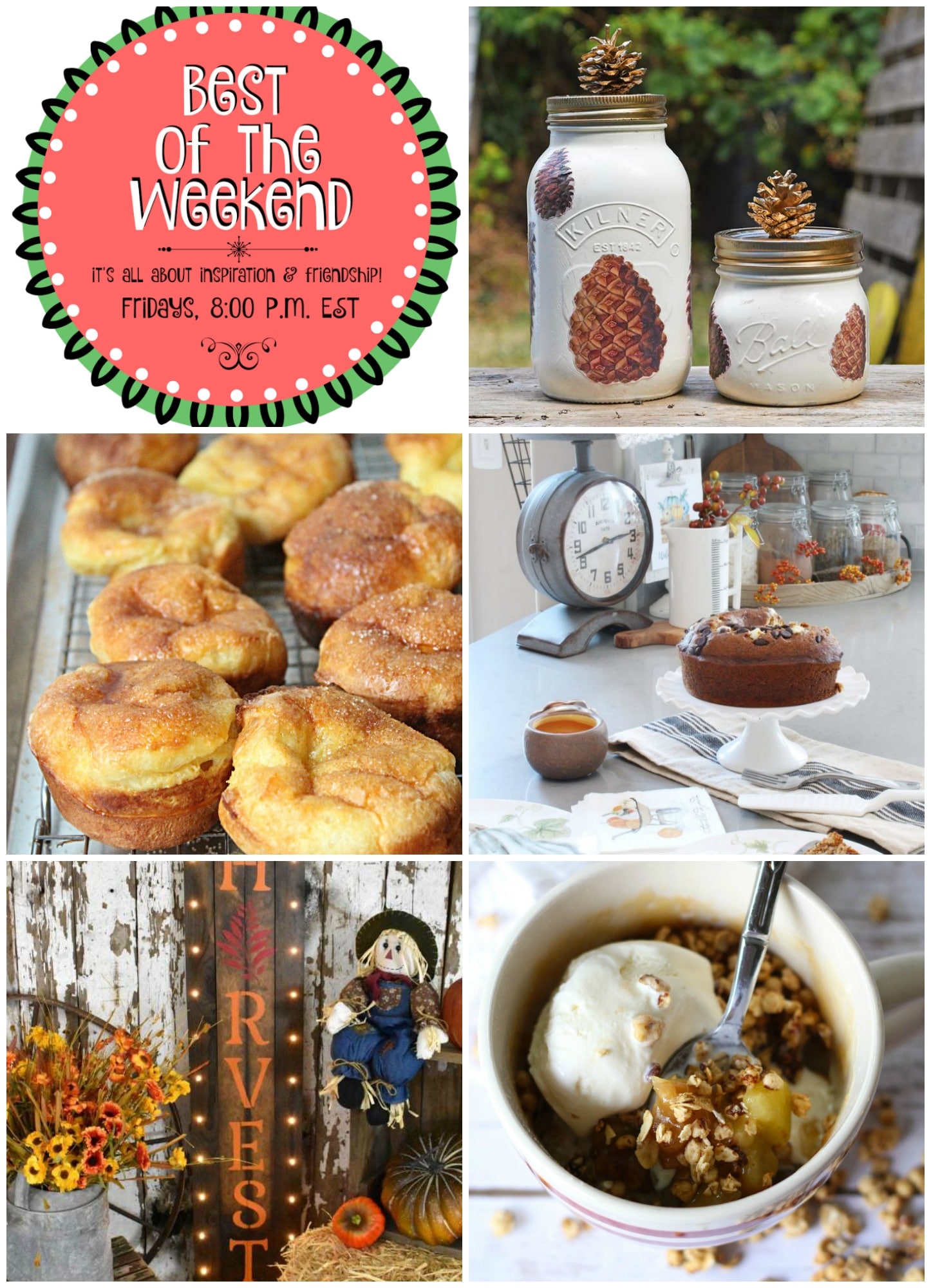Best of the Weekend Features for September 14, 2018 - Pine Cone Mason Jars I Light and Airy Cinnamon Popovers I Fall Kitchen Tour I DIY Lighted Harvest Sign I Dark Chocolate Granola Apple Mug Cake