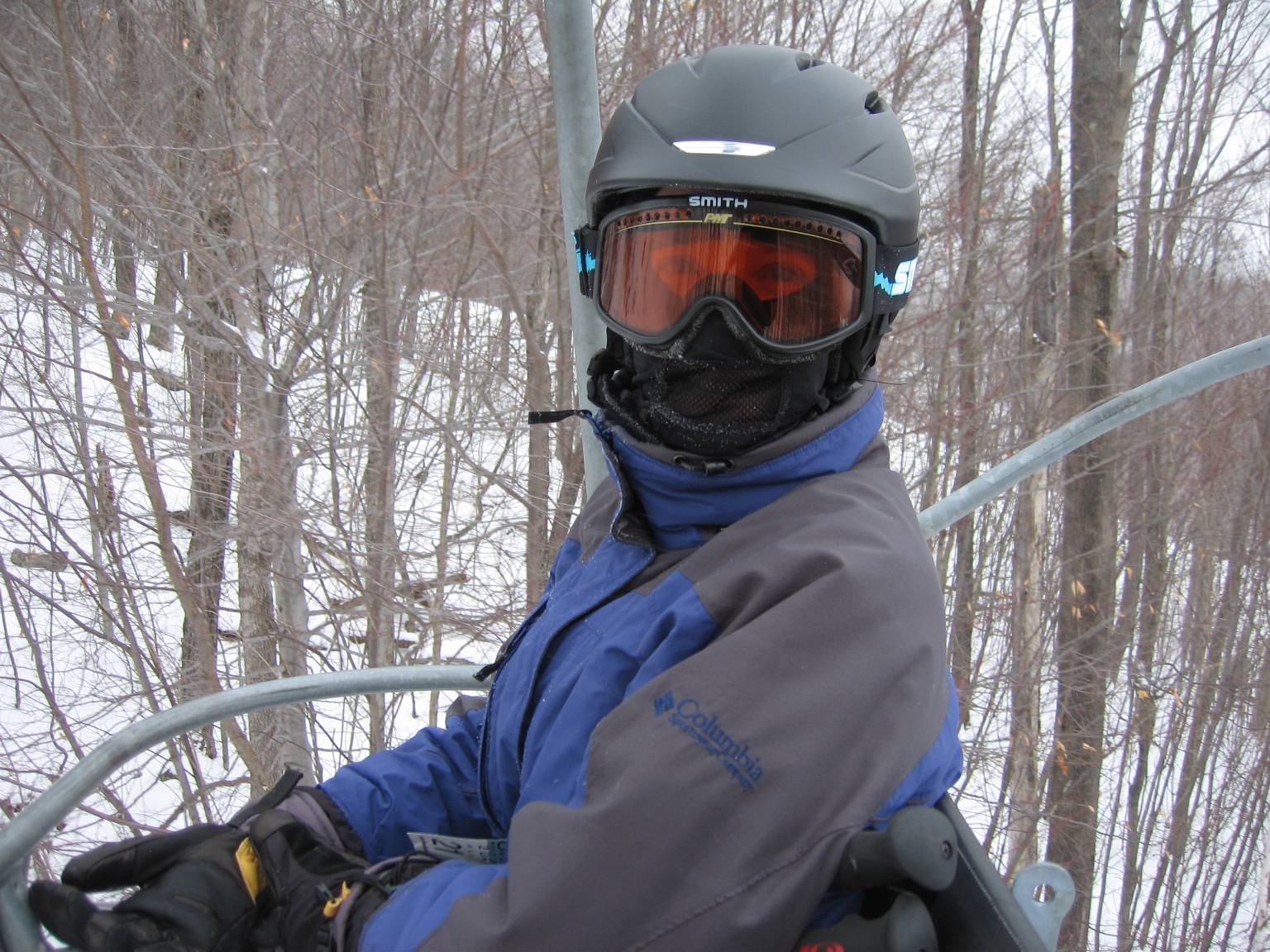 Eight degrees without the windchill means that every bit of skin must be covered.  I am so glad that we bought helmets last year.  They are so warm and I feel much safer skiing with it.