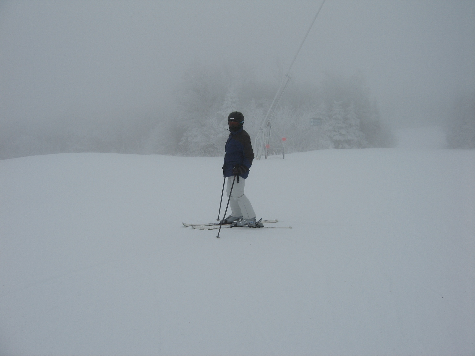 It snowed while we skied on Wednesday.  The visibility was very low on the mountain top.