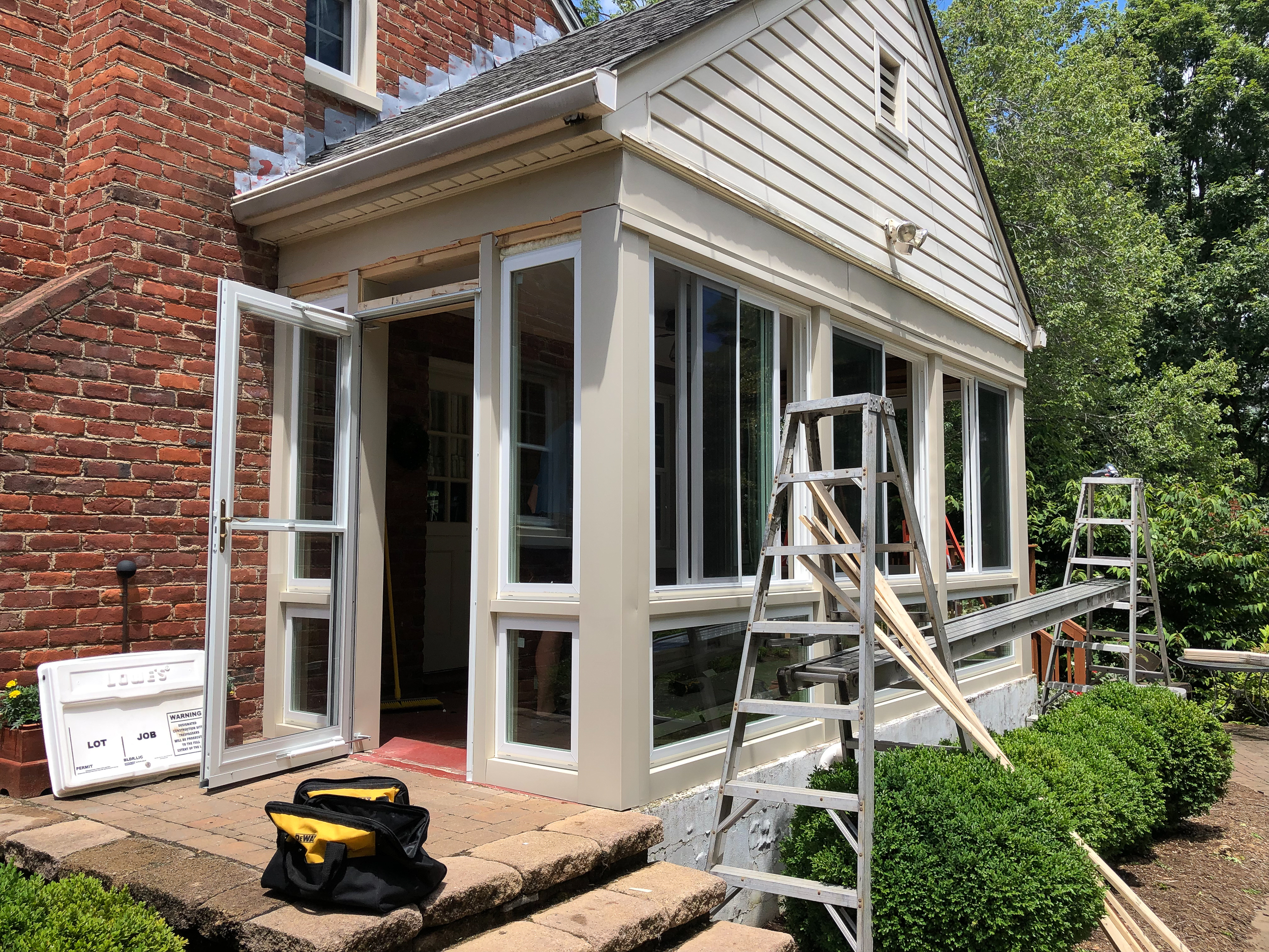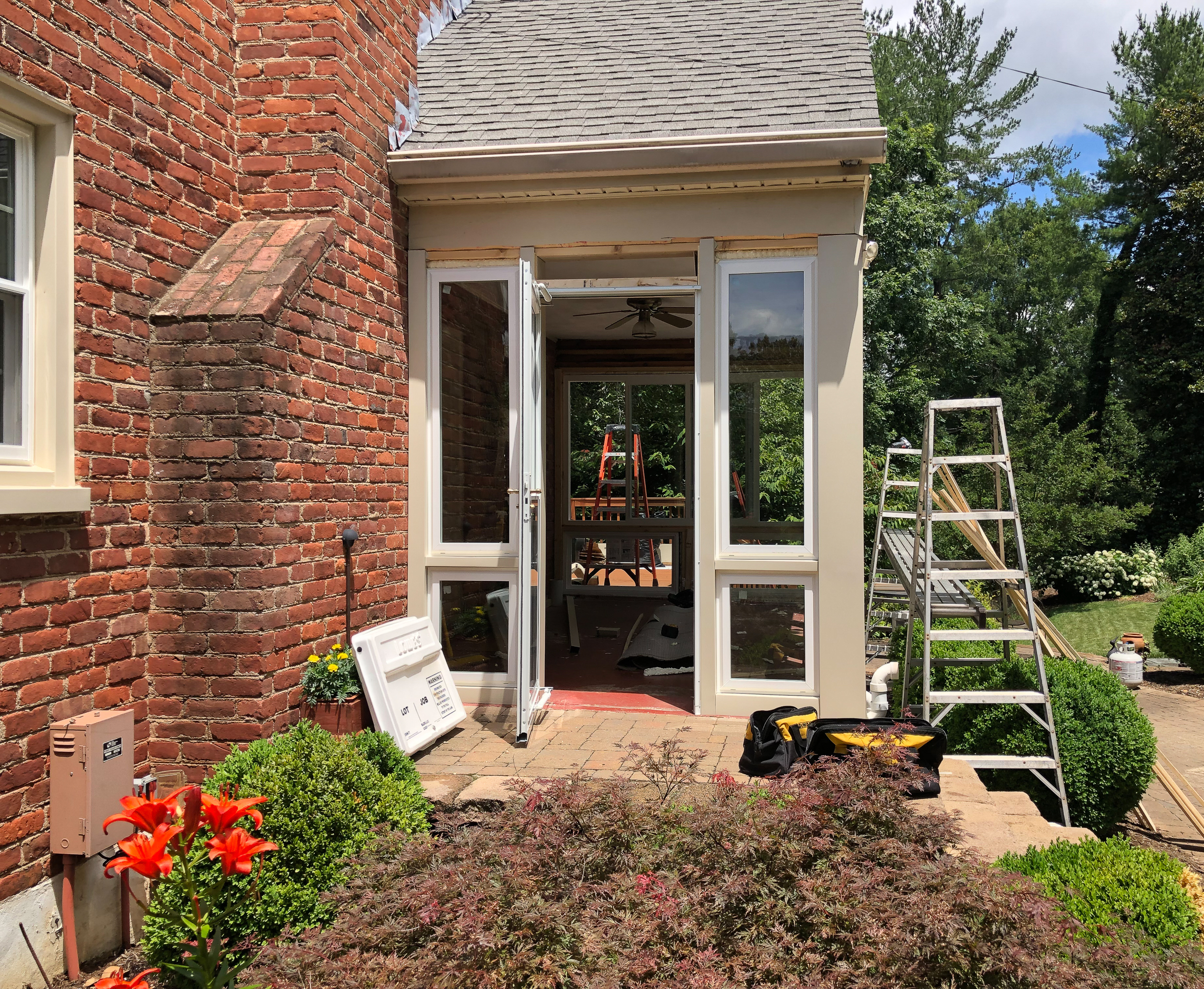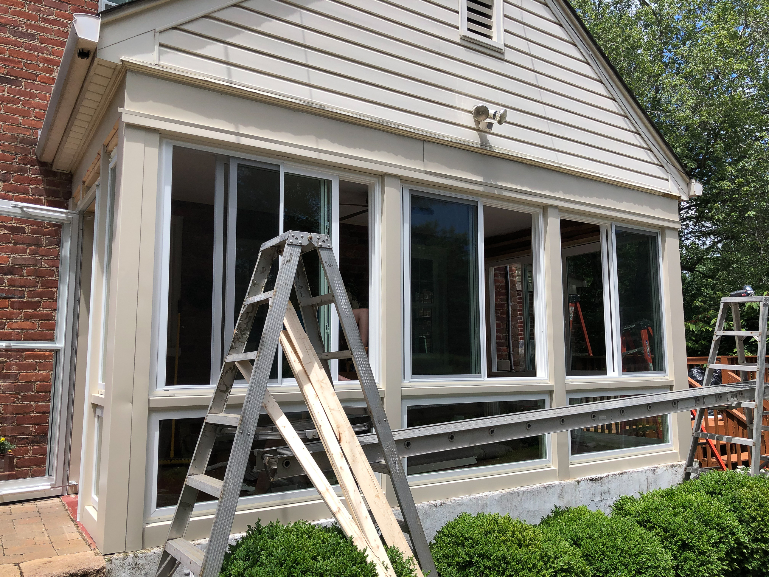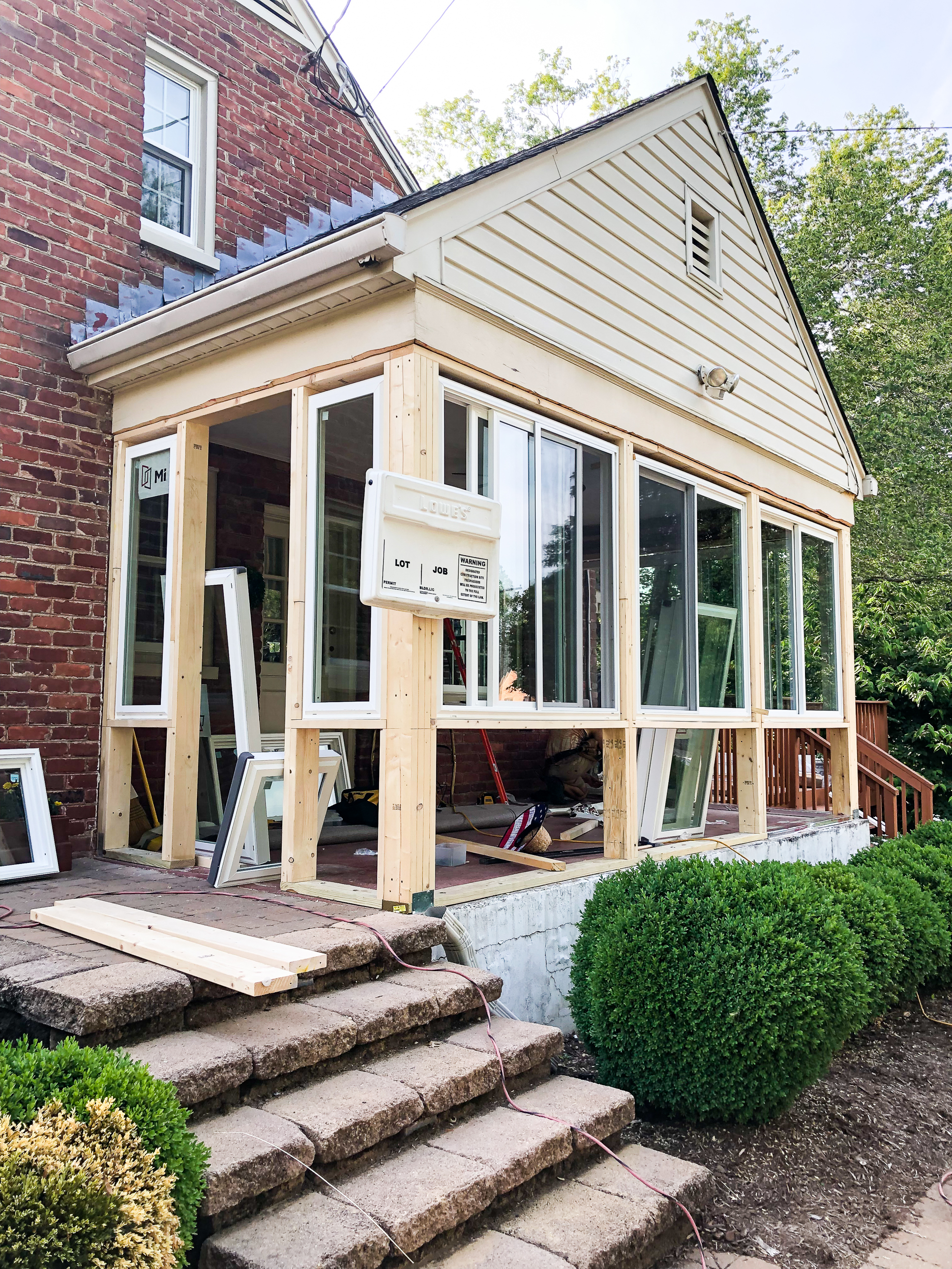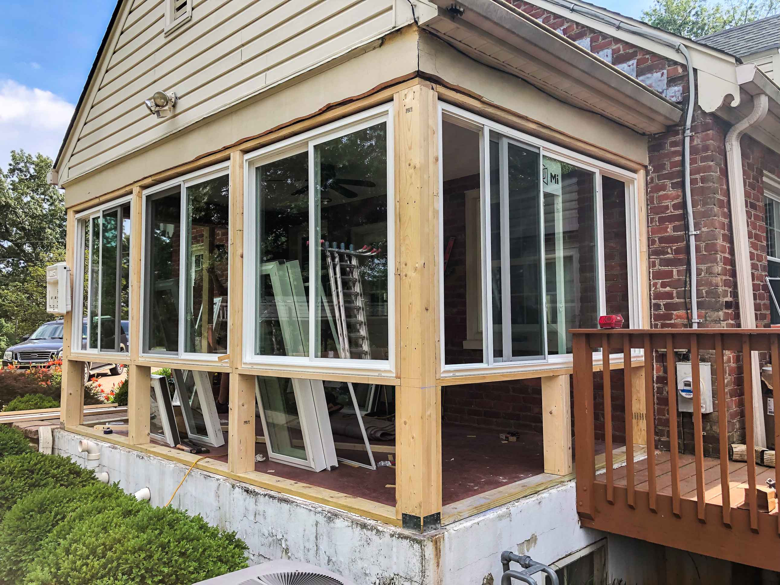 Converting a screened porch to a sunroom. Progress photo of the project.