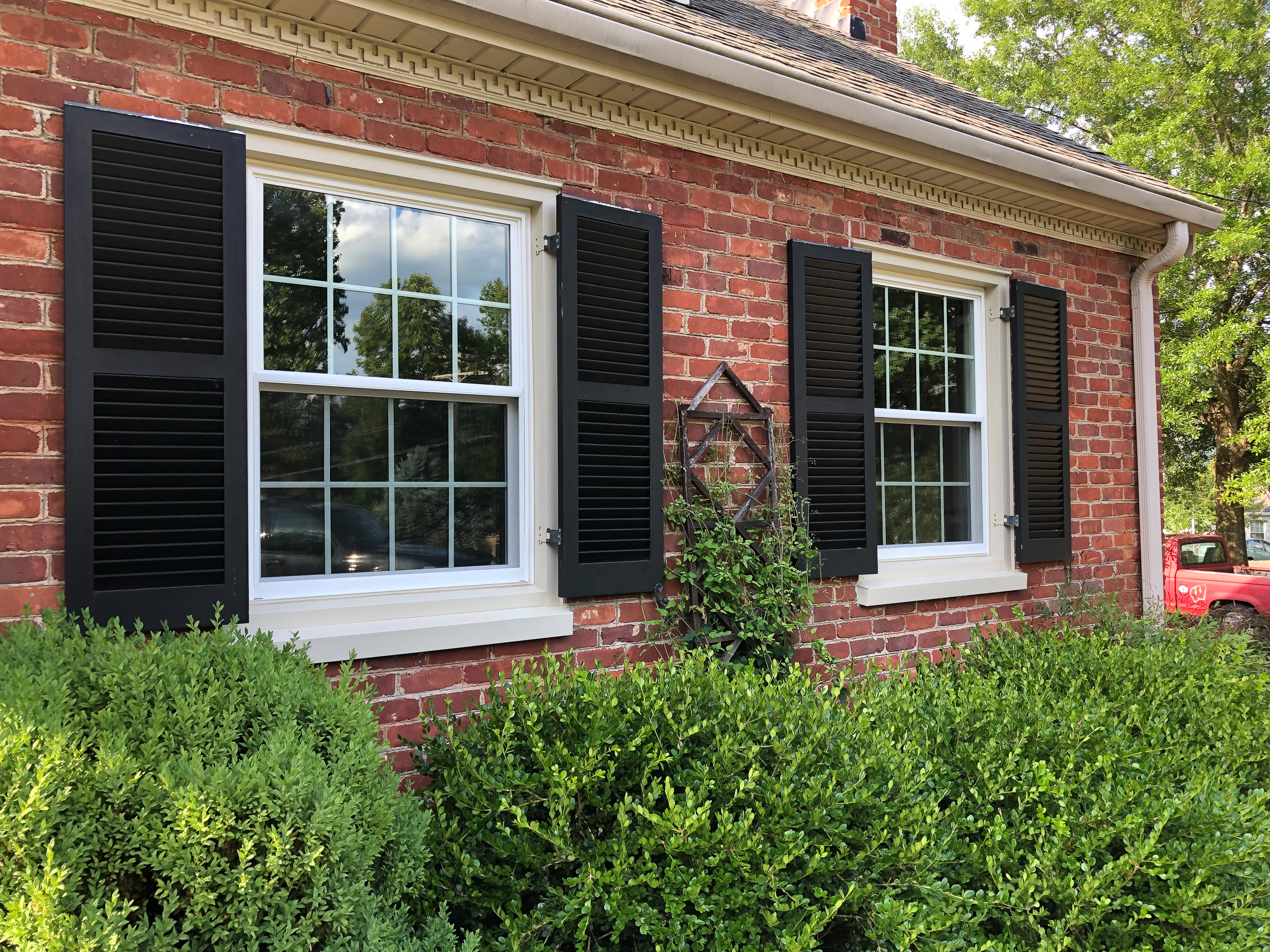 We agonized over the color of the windows (and grids) versus the color of the house trim.  We finally decided on white windows while maintaining the tan trim color.  We love the resulting look.  Here you can see the wood brick molding and the window sill clad in tan aluminum to be maintenance free.  Note that we were able to keep the shutters with the replacement windows and clad molding.
