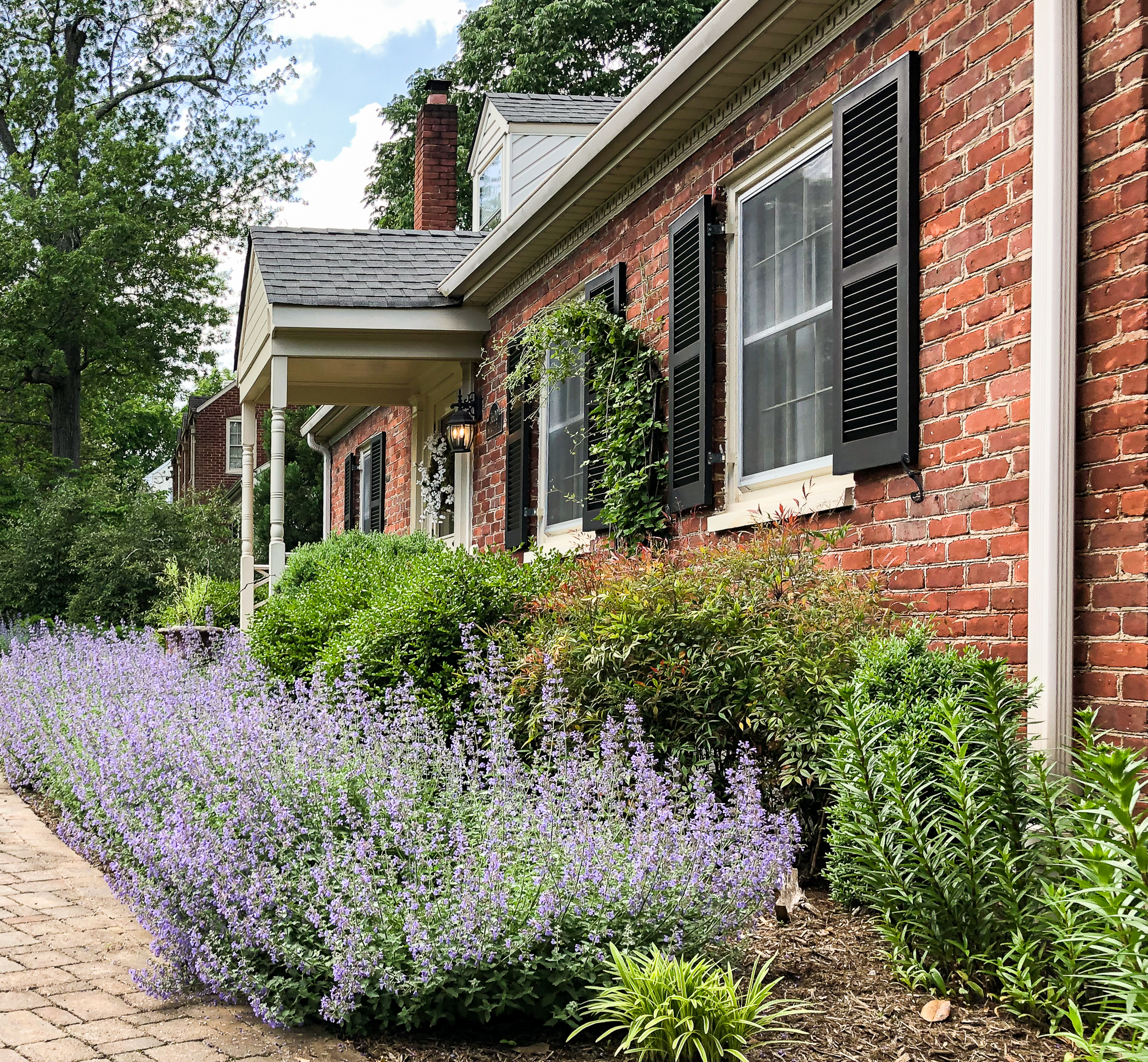 Unfortunately, Boxwoods in my area are dying from Boxwood Blight.  The three dying Boxwood beside our steps need to be dug out and disposed of.  I have my fingers crossed that the Boxwoods on the long side of the porch won’t die from this.