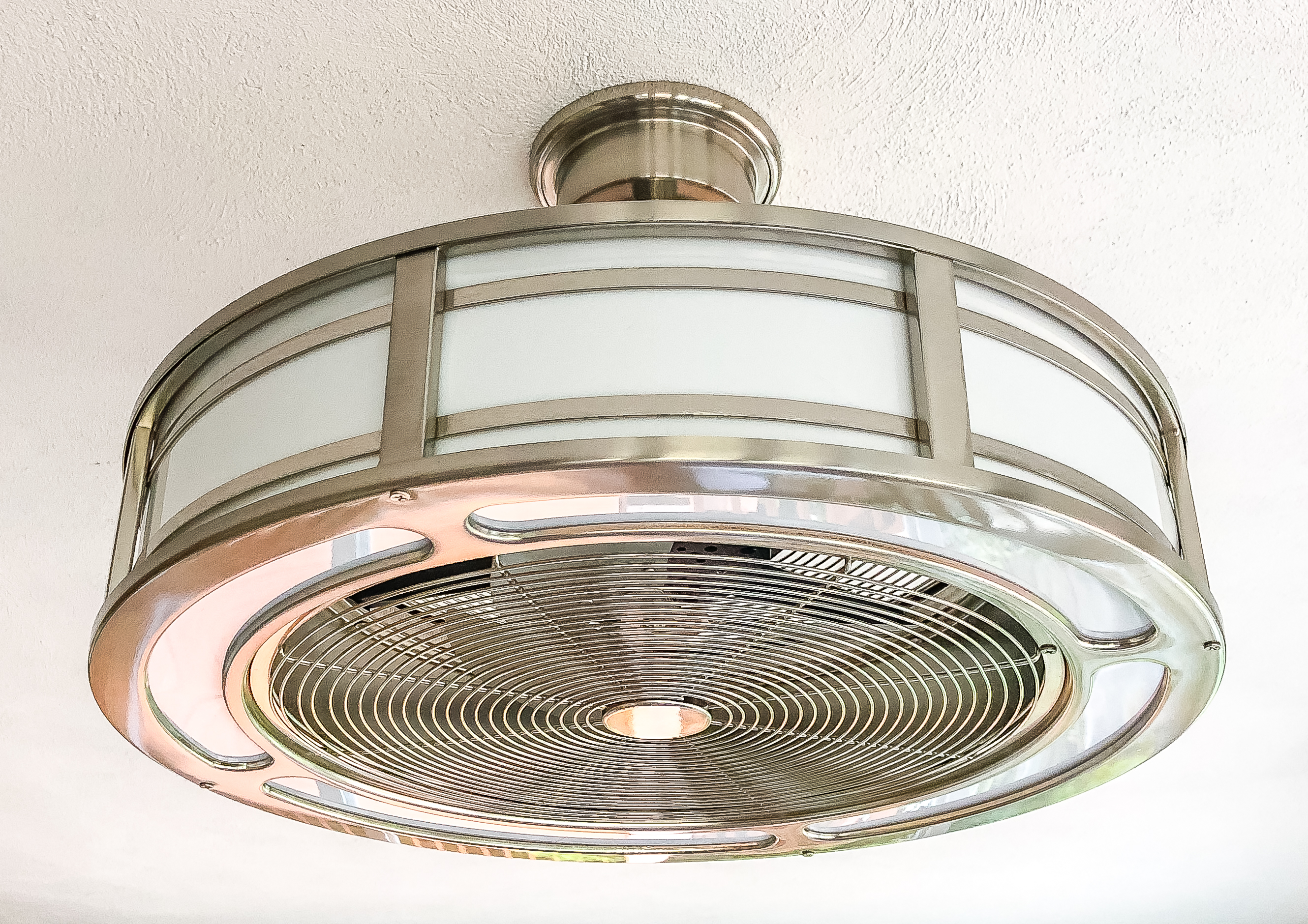 We love the look of our new ceiling fan.  We chose the Home Decorators Collection Brette 23″ Indoor/Outdoor Brushed Nickel fan from Home Depot.