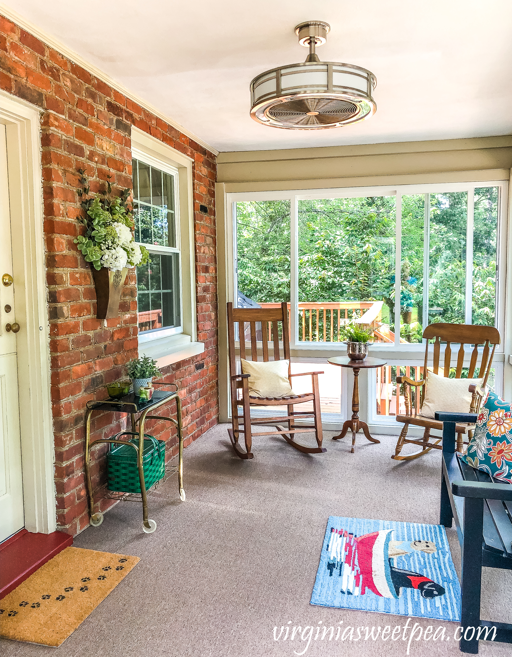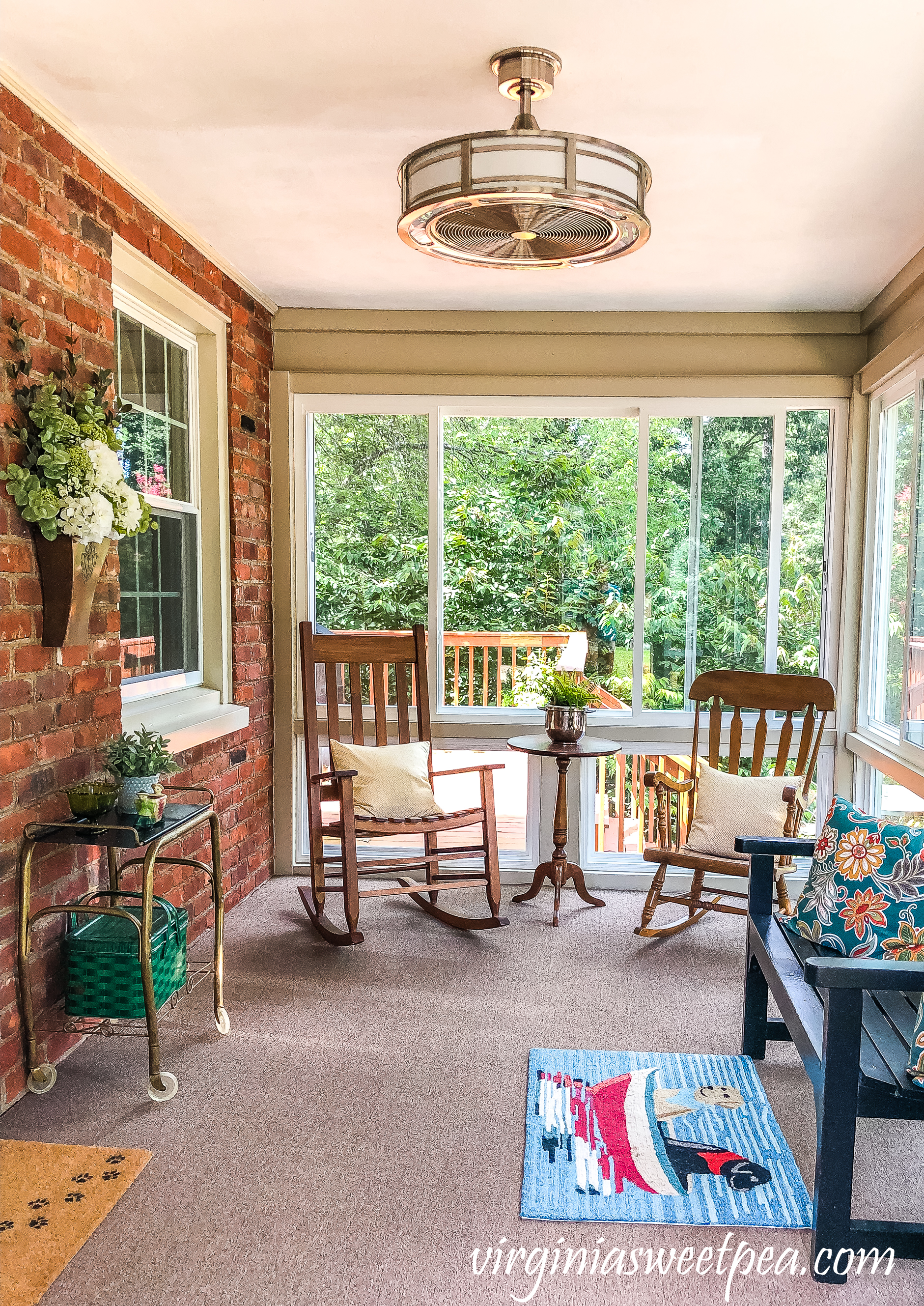 After the sunroom was complete, I cleaned and painted the floor and also cleaned the rug using my mom’s carpet cleaner.  We also painted the ceiling and updated the ceiling fan.