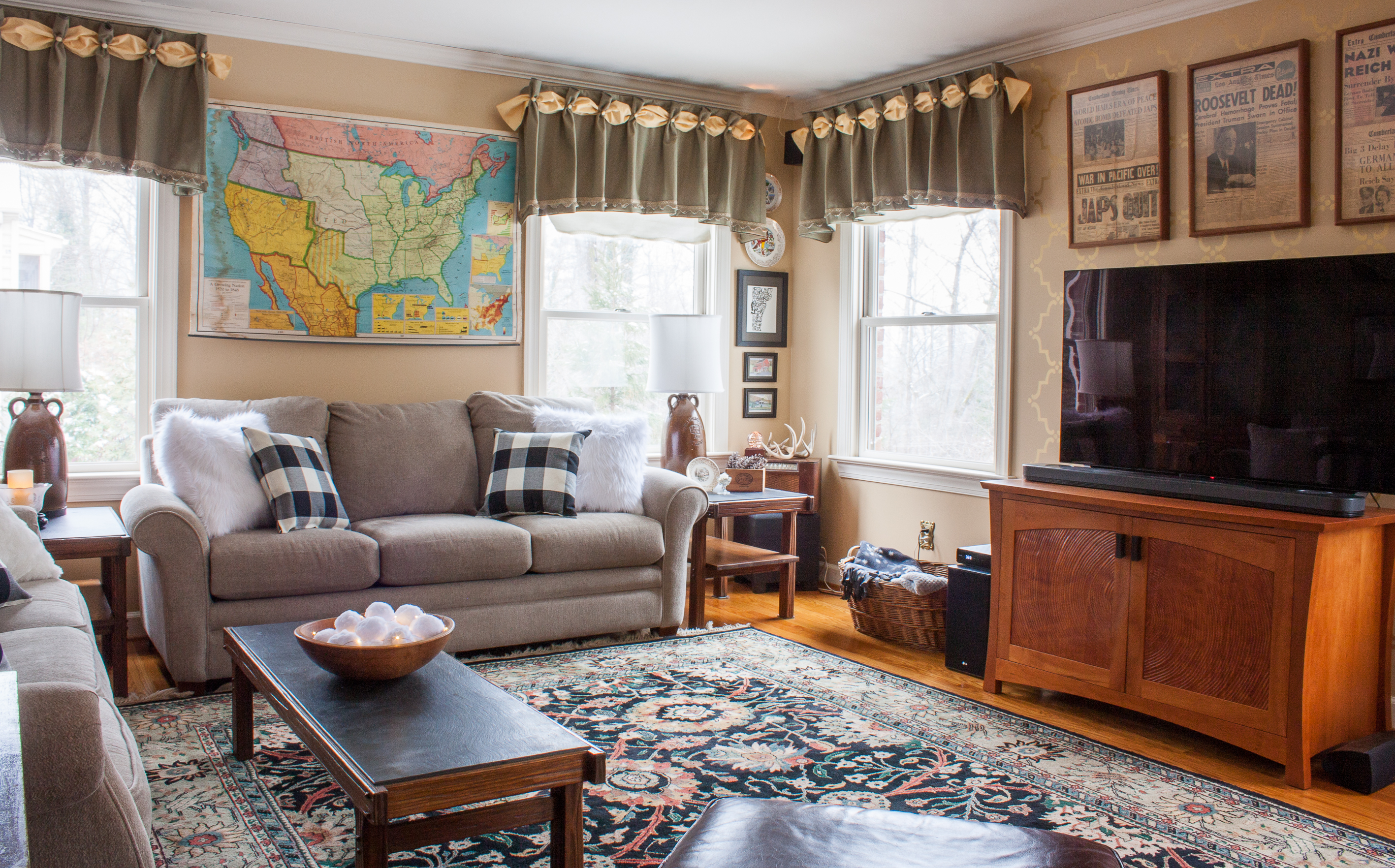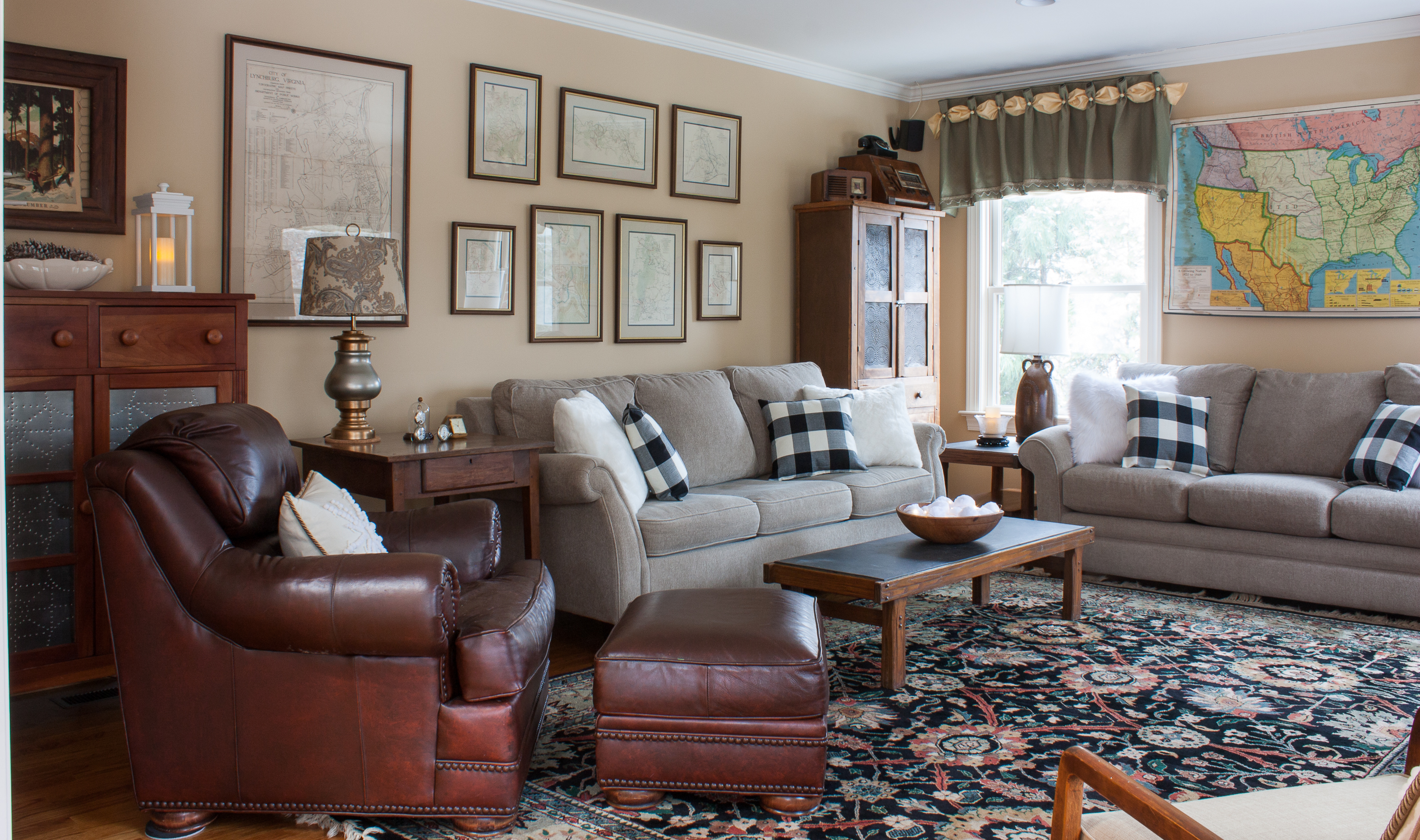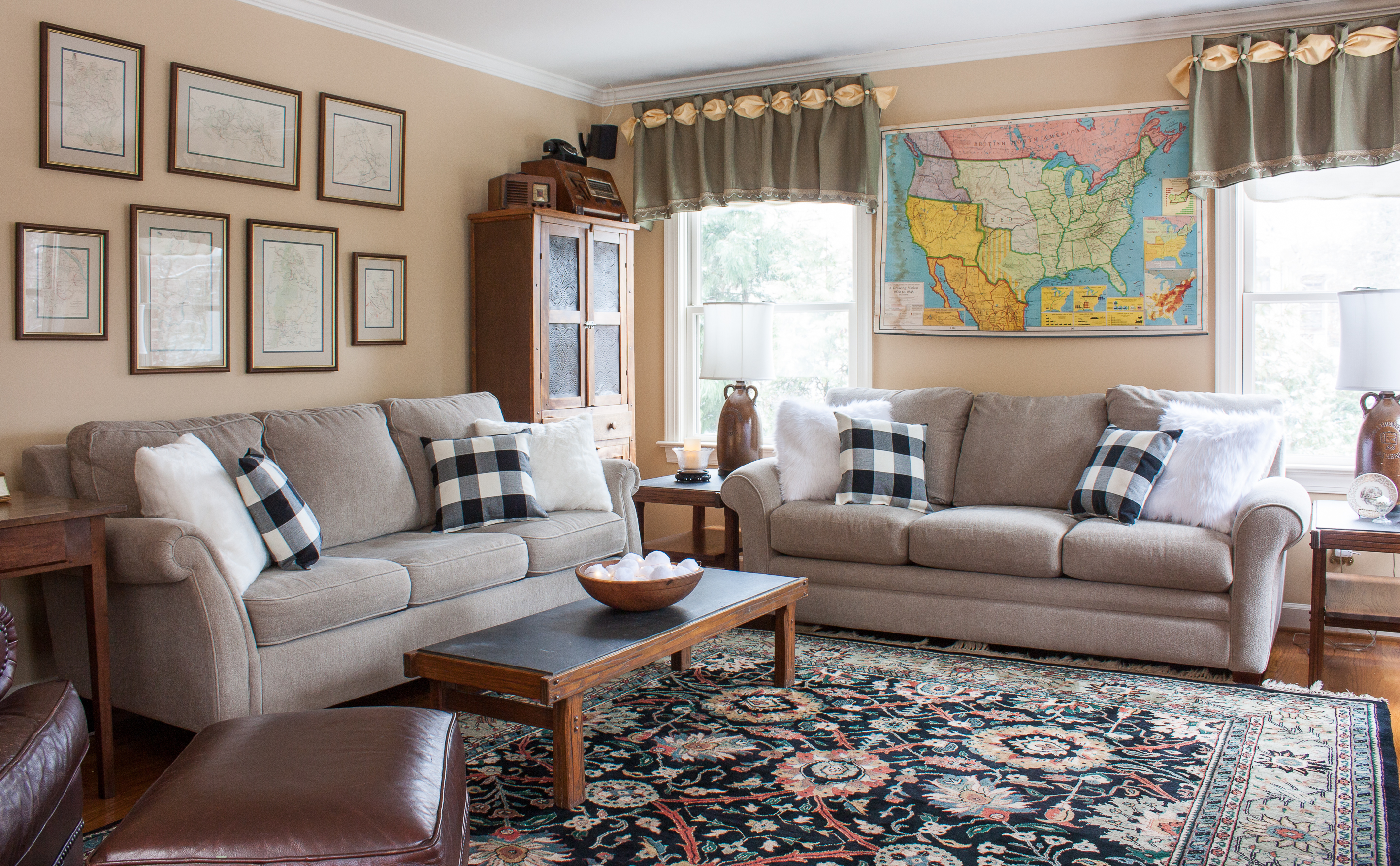 We love old maps and especially love the collection of Civil War maps from the Official Records displayed over the sofa on the left.