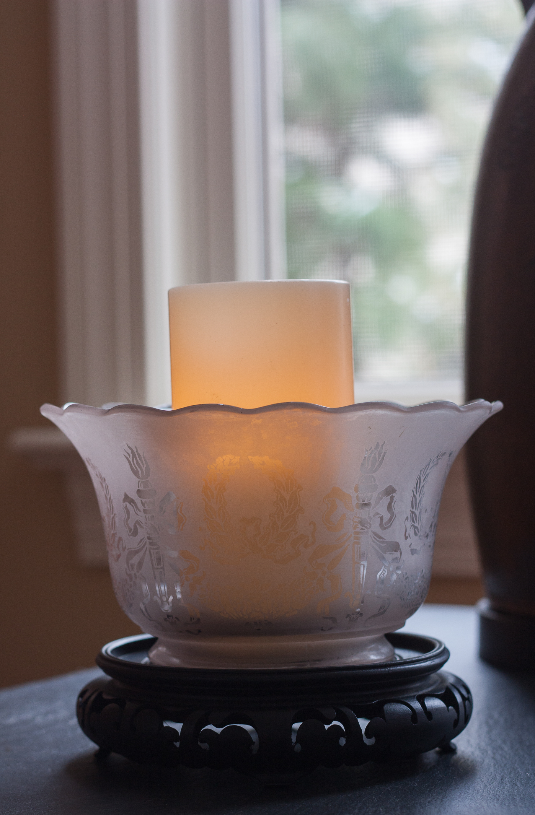 At Christmas my aunt gave me a box of things that belonged to my grandmother that included this pretty glass shade. I don’t know the story of this shade, but I’m pretty sure it was originally used on a sconce. If my grandmother were still around she could tell me exactly who it belonged to and how she acquired it. I sat it on a candle base with a candle that I’ve set to automatically come on at 5 pm for another cozy detail in this room.