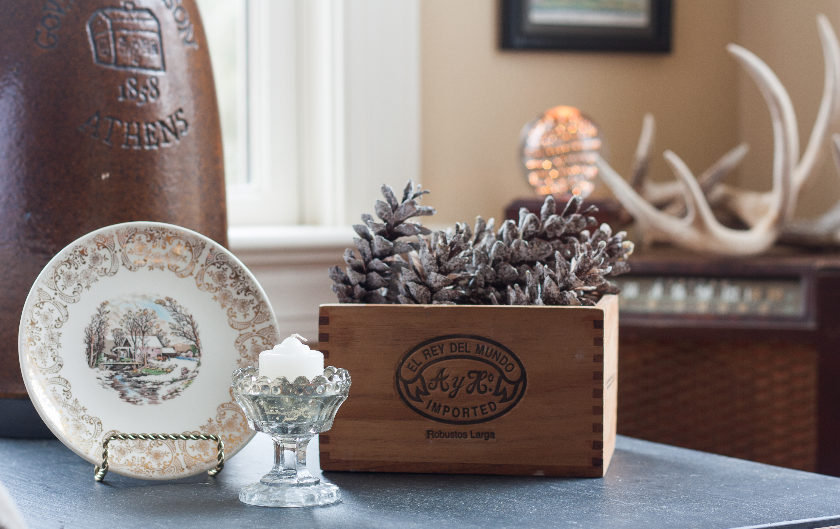 Cozy Winter Detail – Plates, Pinecones, Antlers, and a Light