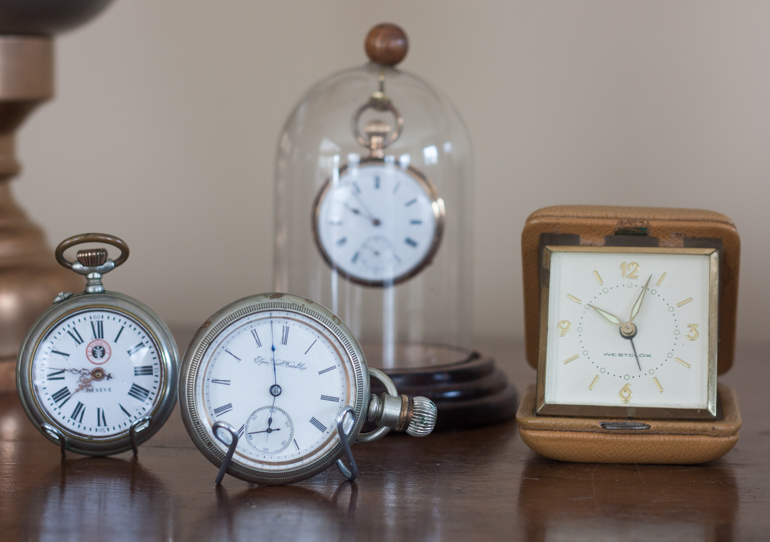 On the table beside the sofa I displayed a small collection of pocket watches and a vintage travel clock. The travel clock and two watches in front belonged to my grandfather. The pocket watch under the glass dome is very old and belonged to my husband’s German maternal great-grandfather.