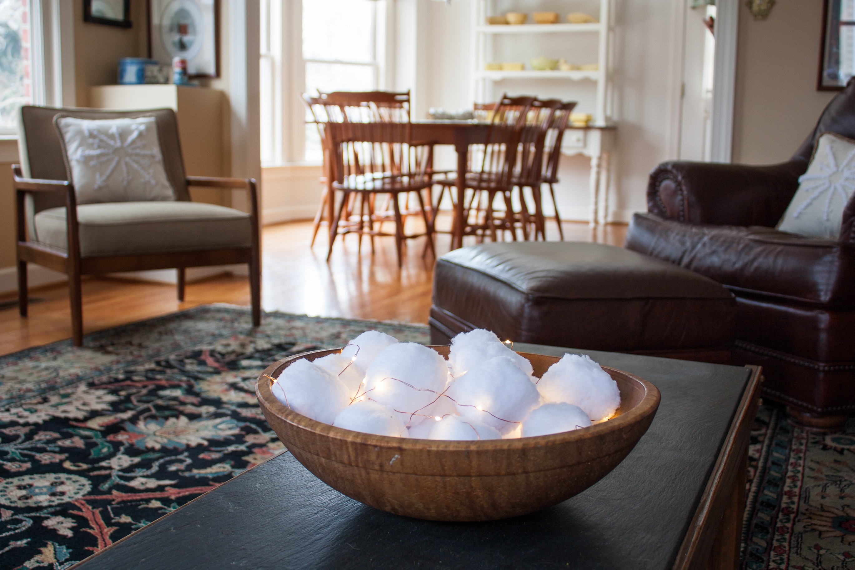 For a winter coffee table centerpiece, I filled a wooden bowl that belonged to my grandmother with pom snowballs that I got at Target before Christmas. Target doesn’t appear to currently carry these but I found similar poms here. I twisted fairy lights throughout the bowl of balls to up the cozy factor. This bowl looks great at night with its glowing lights.