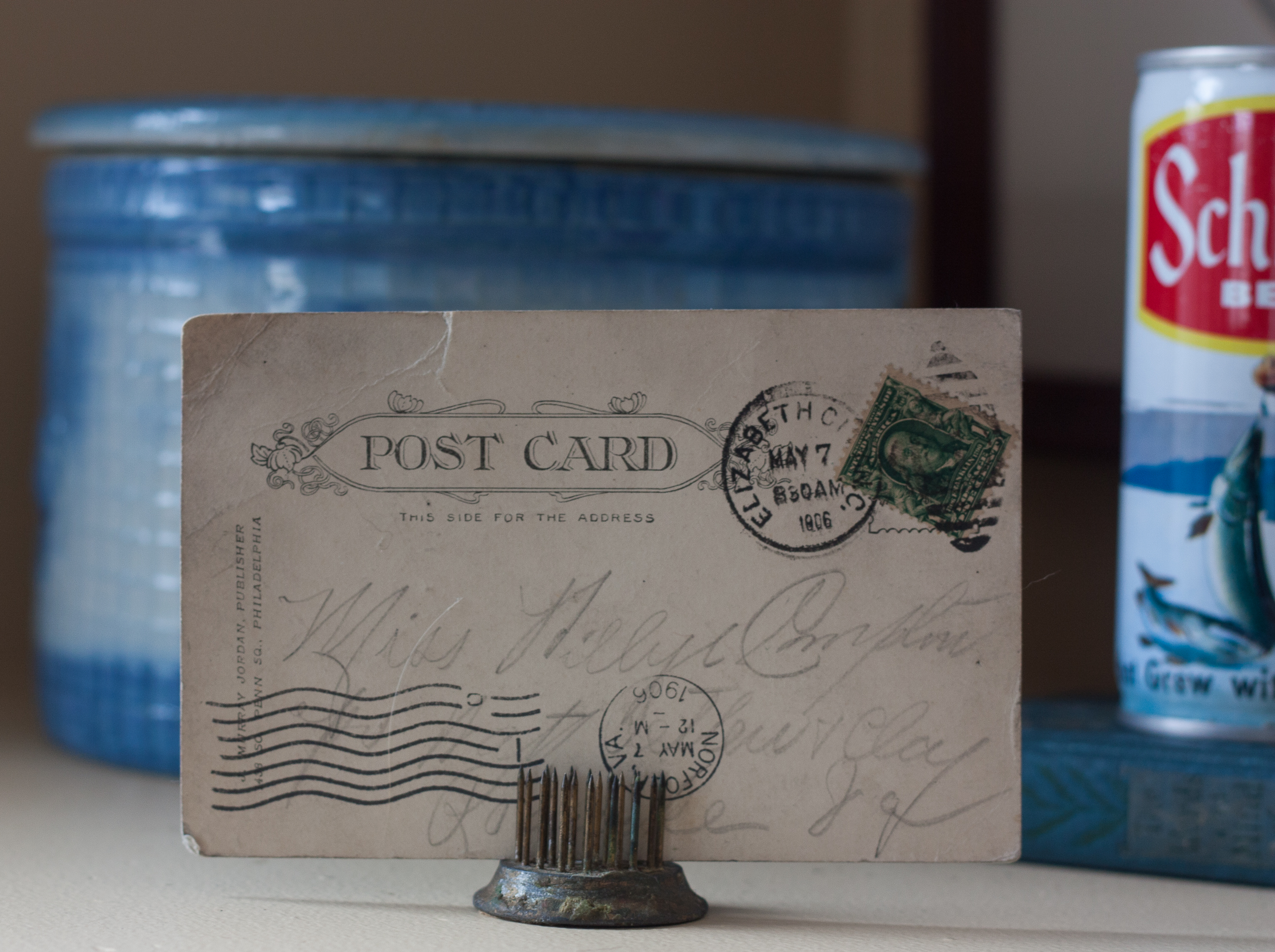 When I think about winter colors, one color that comes to mind is blue. I shopped my basement for blue items to use for winter decor for the shelf in the corner. I started with a blue stoneware covered crock and then added a few more items including this 1906 “You can go as far as you like with me” postcard. This racy 113 year old postcard was sent to my great-aunt.