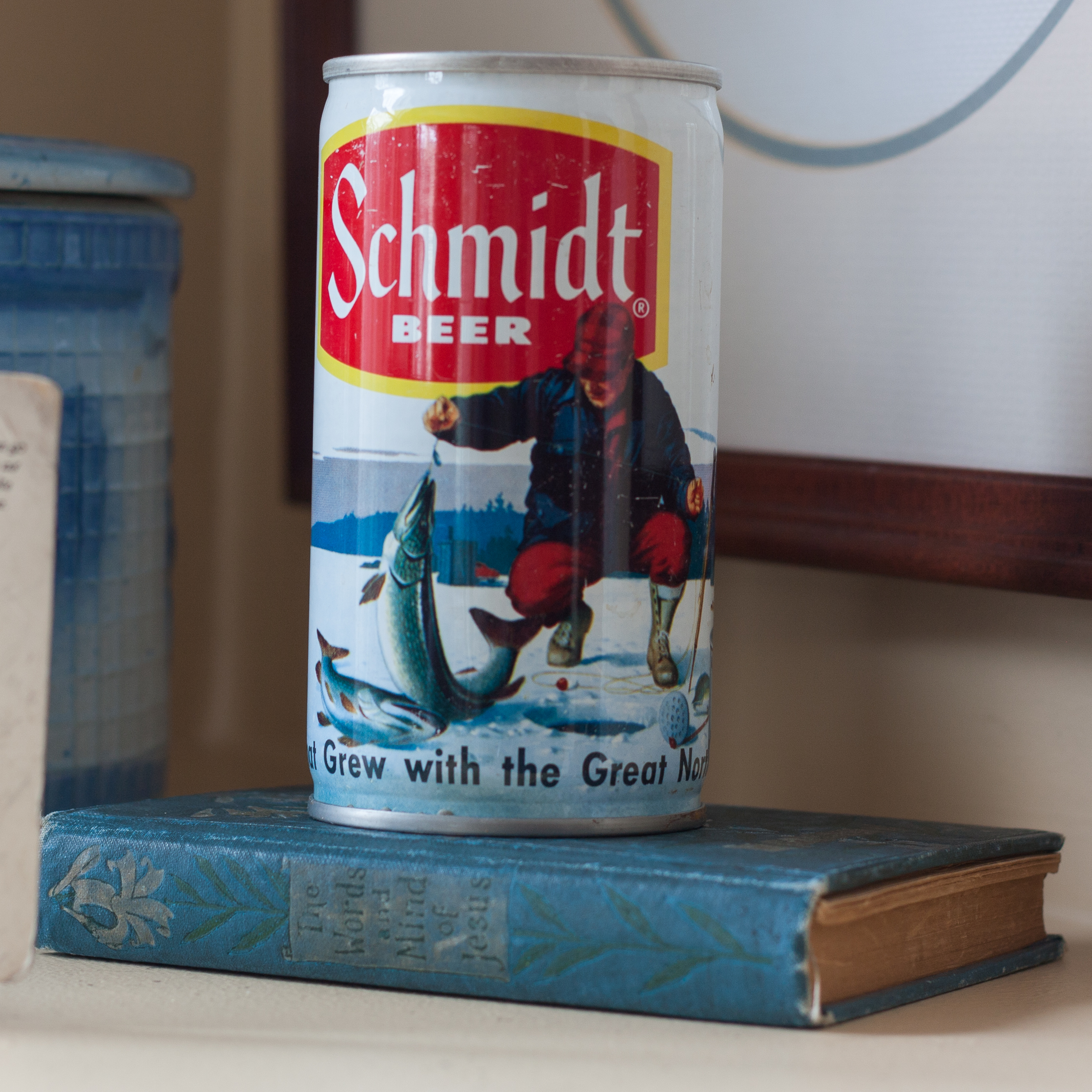 My husband collected beer cans when he was a boy. I liked the winter graphic on this Schmidt can and elevated it a bit using a blue book that just happens to be about Jesus. This “The Words of Jesus” book was given to my grandmother December 25, 1926. Oops, sorry to display beer and Jesus together, Granny. You can see more vintage beer cans in my husband’s collection here.