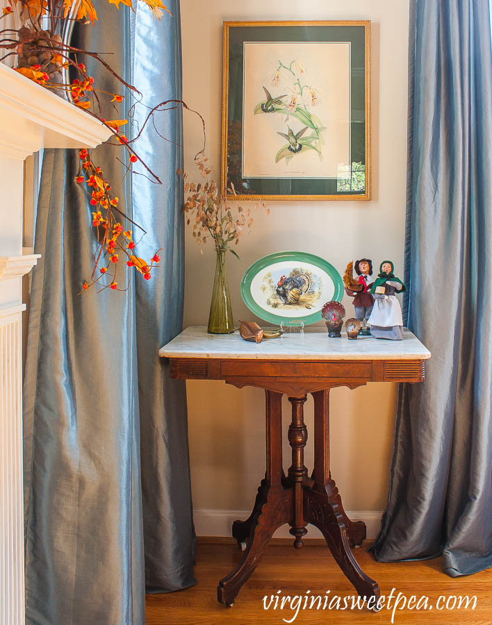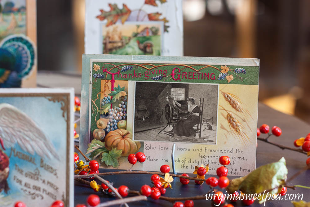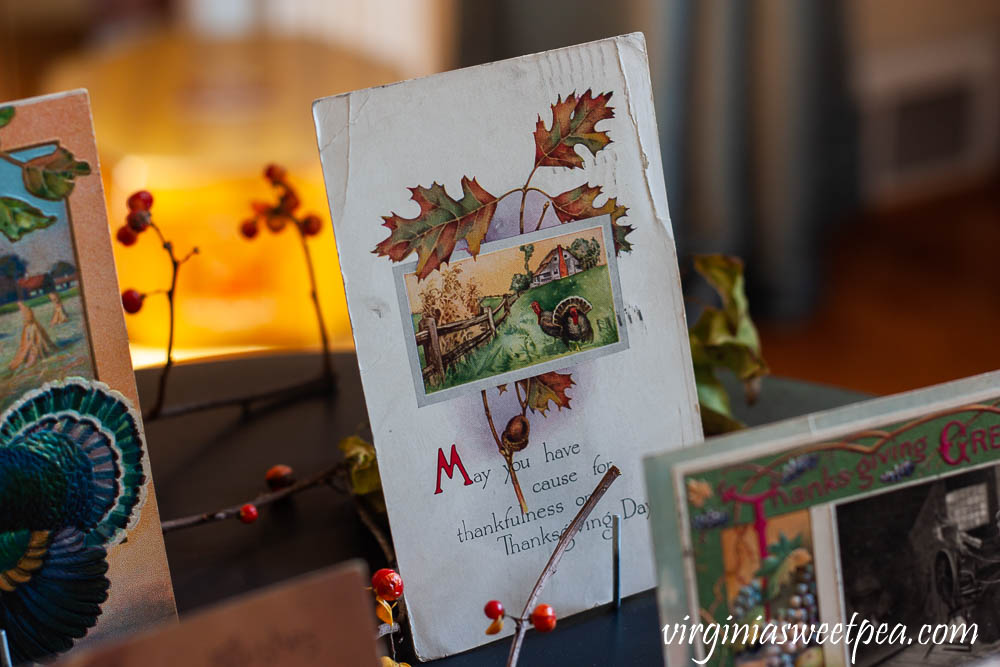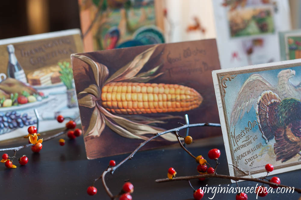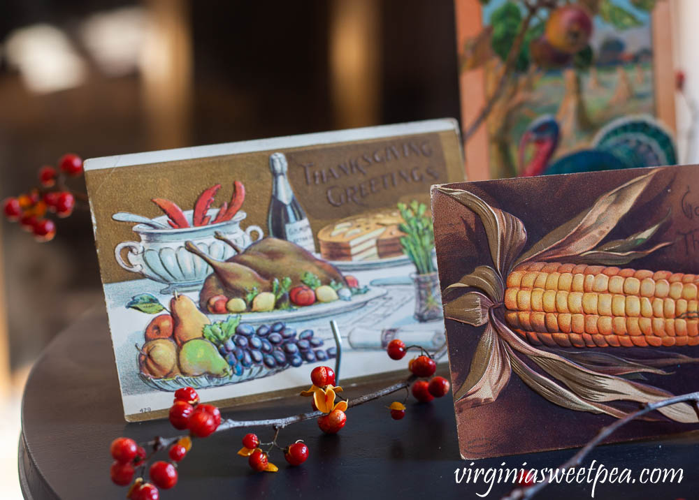 I decorated the table between the wing-back chairs with vintage Thanksgiving postcards.