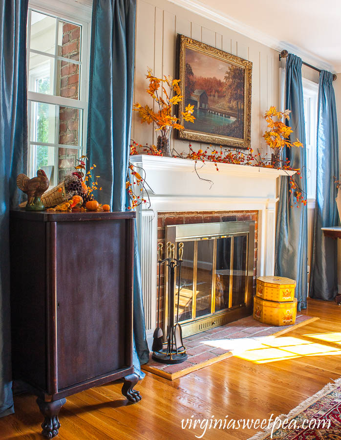 For Thanksgiving decorating, I kept my fall mantel decor the same and also the pillows on the chairs. I switched the decor on all of the flat surfaces from fall to Thanksgiving.