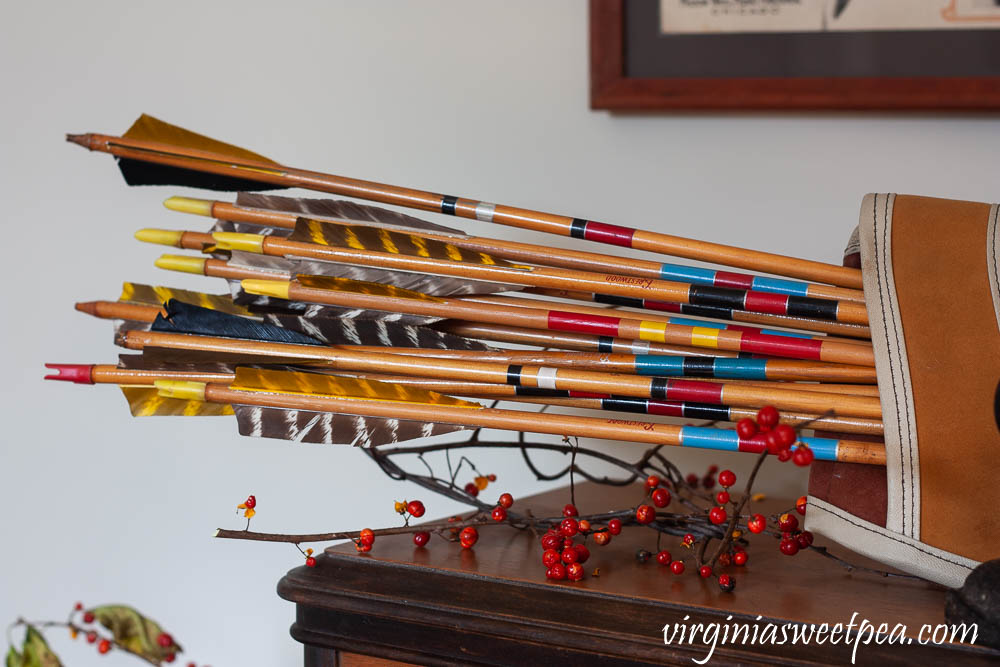Indians make me think about hunting with a bow and arrow which led to using my dad’s boyhood quiver and arrows for decor.