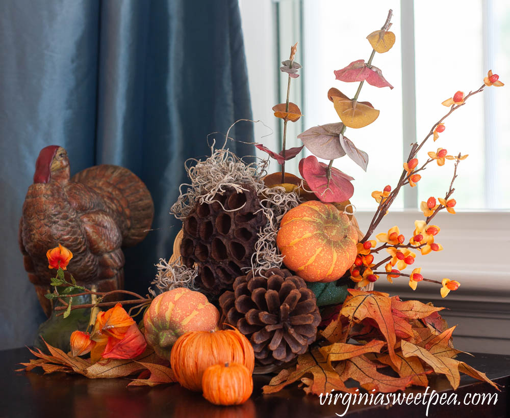 I decorated the music stand to the left of the mantel with a turkey and one of my grandmother’s cornucopias.