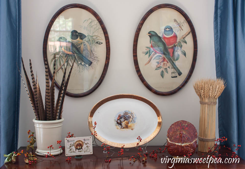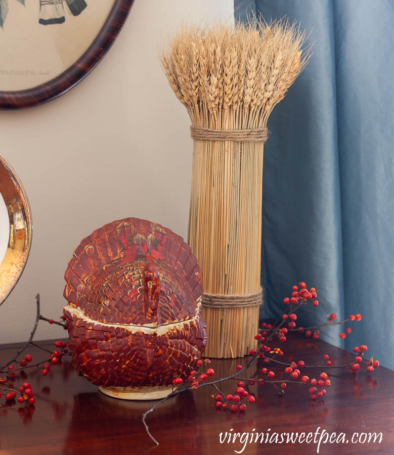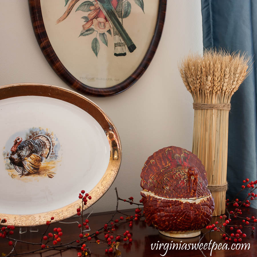 To the right of the turkey platter, I used a wheat sheaf and a vintage turkey-lidded dish.
