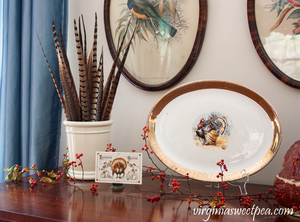 I have collected vintage turkey platters for a long time and used this beautiful platter with a gold rim in the center of my display.