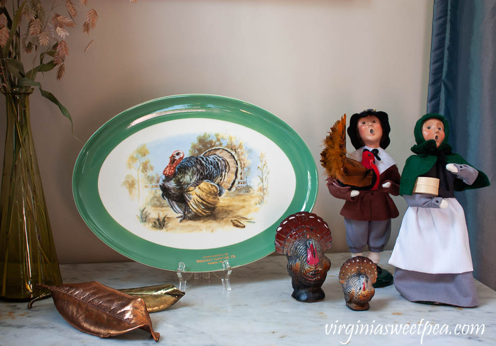 To the right of the turkey platter, I used two vintage turkey candles from my collection and a Byers’ Choice male and female pilgrim.