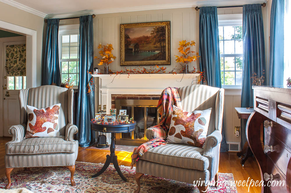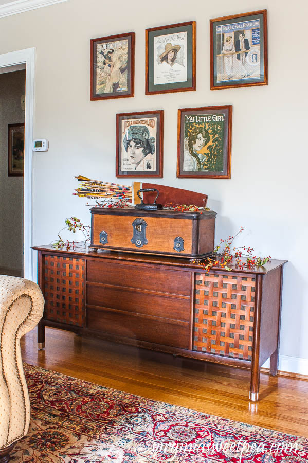 Paula, this room is a fall delight. So warm and cozy … and traditional. I love it. Your family’s postcard are treasures … as are all the wonderful pieces you have passed down from family and vintage hunting with your mom. It’s just a beautiful room … I’m sure Sherman enjoys it too! xo