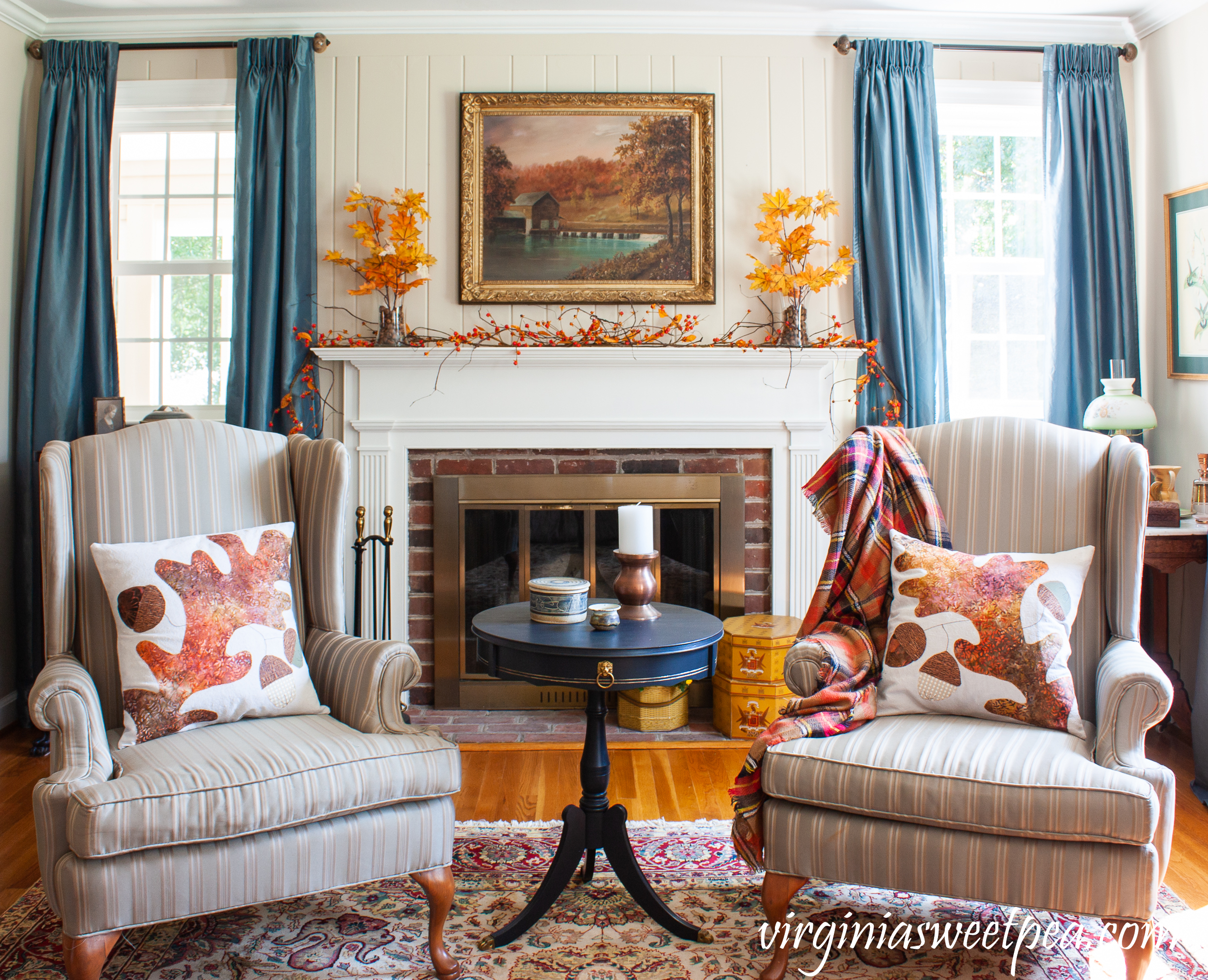 Another spot in my formal living room that I like to decorate is the table to the right of the fireplace. This table usually has a lamp on it but I borrowed it from this table to use in our family room with a fall lamp shade that I’ve had for years. I’ll share our family room’s fall decor next week.