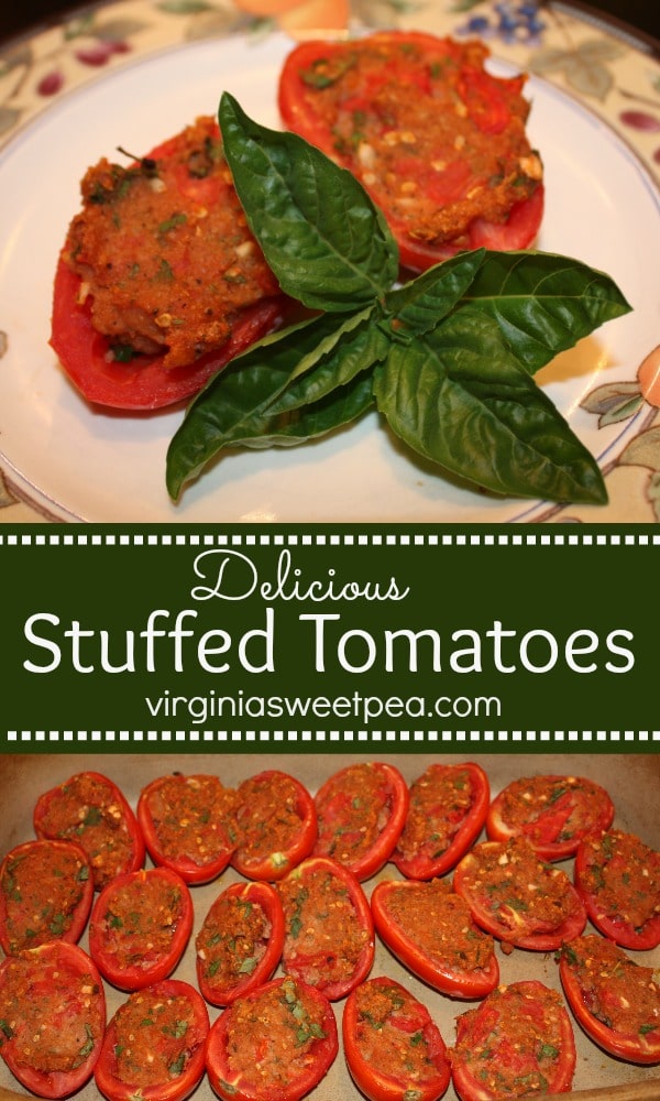 Delicious Stuffed Tomatoes - Use fresh from the garden Roma tomatoes to make this delicious side dish. virginiasweetpea.com #tomatoes #RomaTomatoes #sidedish #stuffedtomatoes