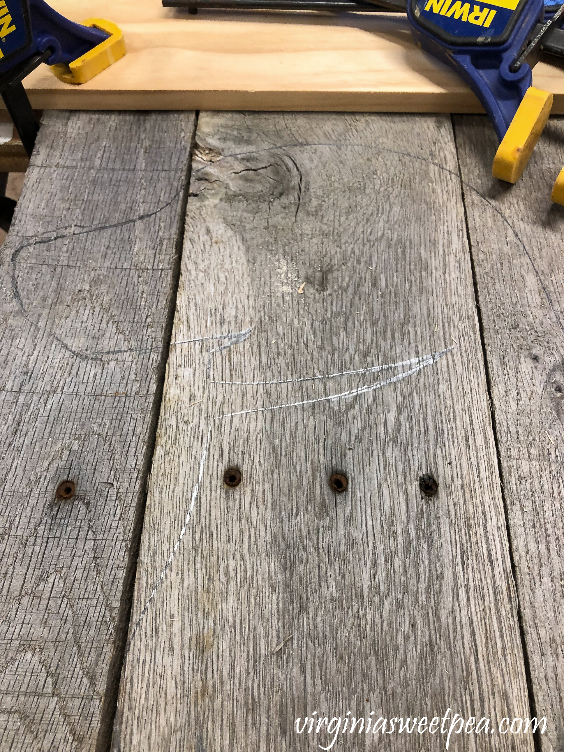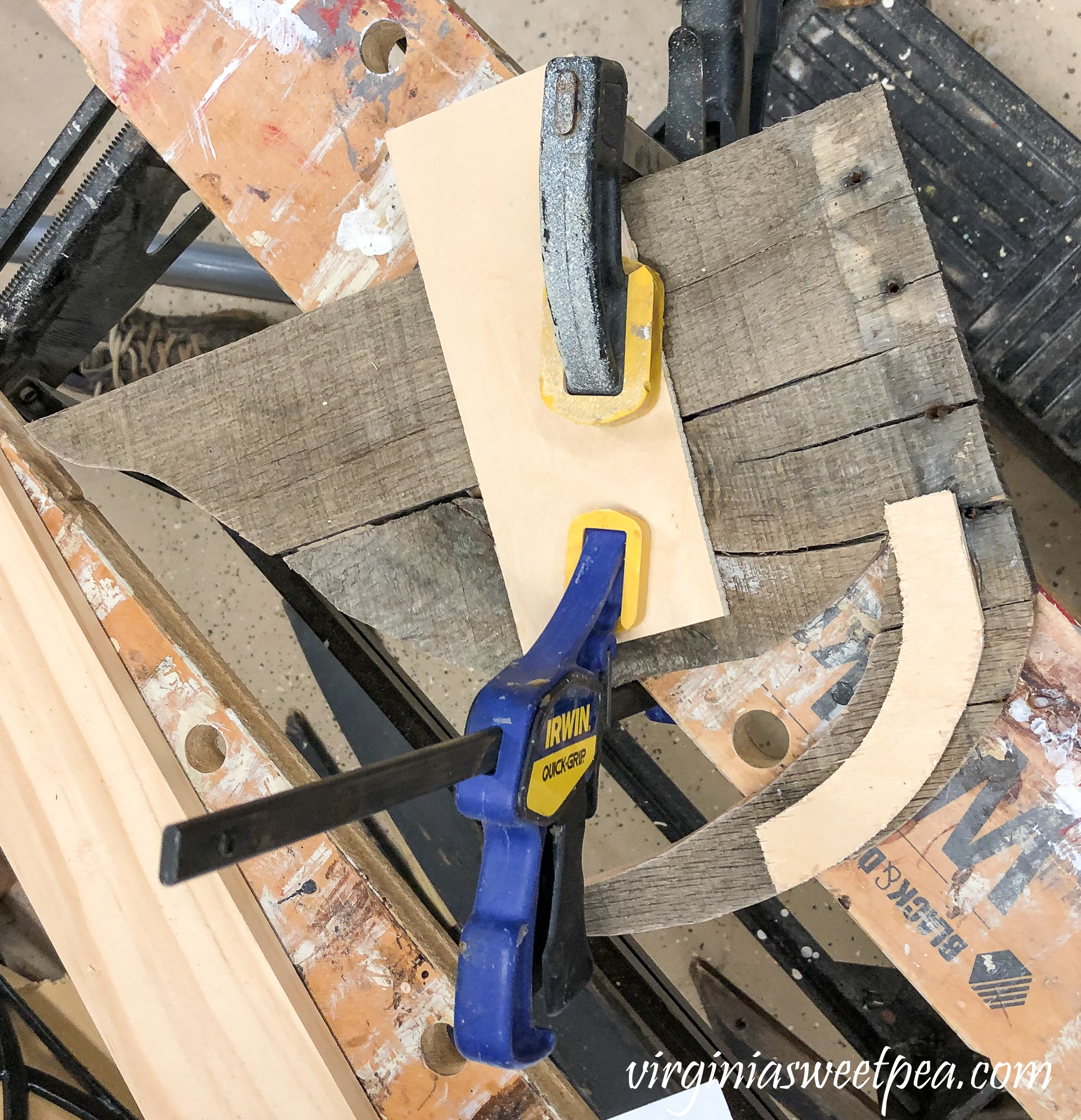 Line up pallet wood pieces and hold in place with a board clamped to the wood pieces.