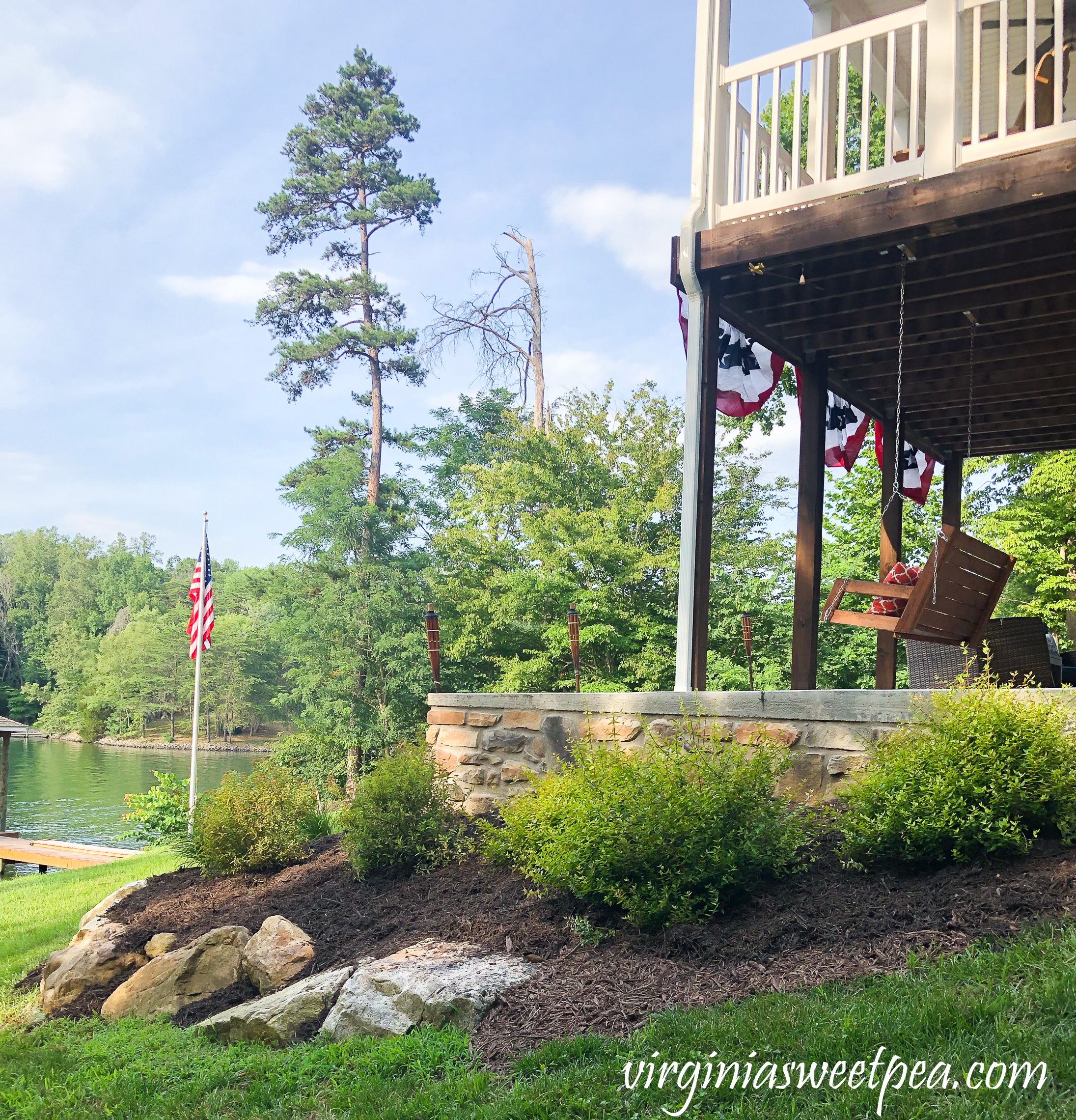 A flagpole is another new addition to our lake property.  Mr. SP gave this to himself for his birthday in April.  Our neighbors love it and it makes it easy for friends to find our house by water as we are the only home in our cove to have a flagpole.  The bunting was a 4th of July addition to our deck and we love it so much that it will stay in place until fall.Deck and Patio lake view at Smith Mountain Lake, Virginia house