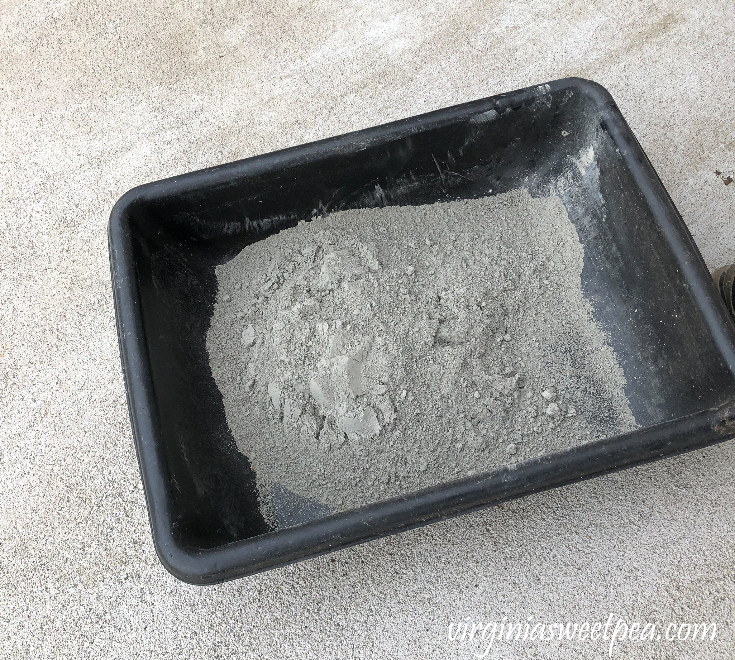 To mix the concrete, we started with mortar in a mixing tray.Mixing concrete to use to face a patio wall with stone veneer.