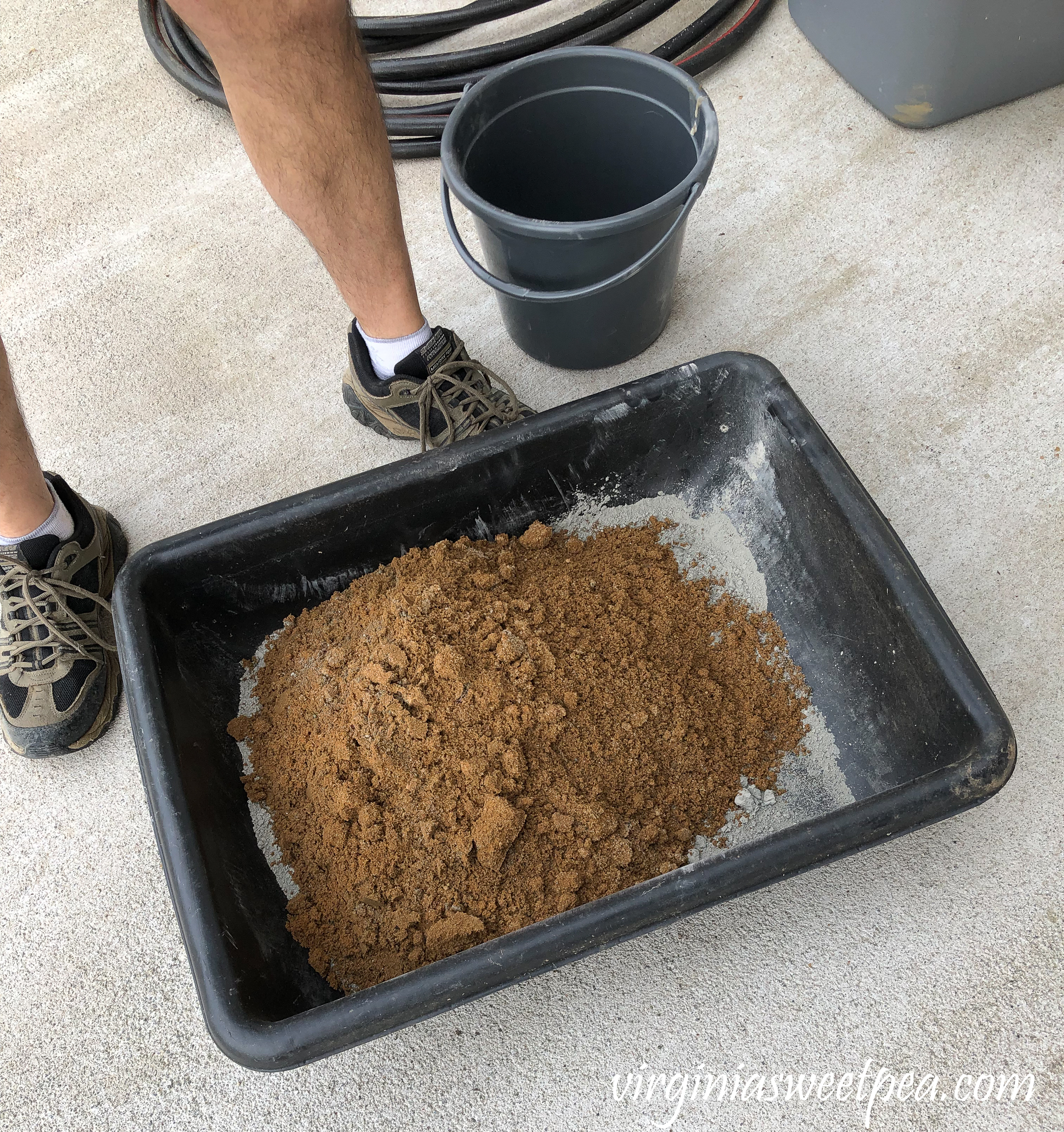Next the masonry sand was added to the mortar.  We used a small bucket to transport the sand from the heavy 5 gallon buckets to the mixing tray.Mixing concrete to use to face a patio wall with stone veneer.