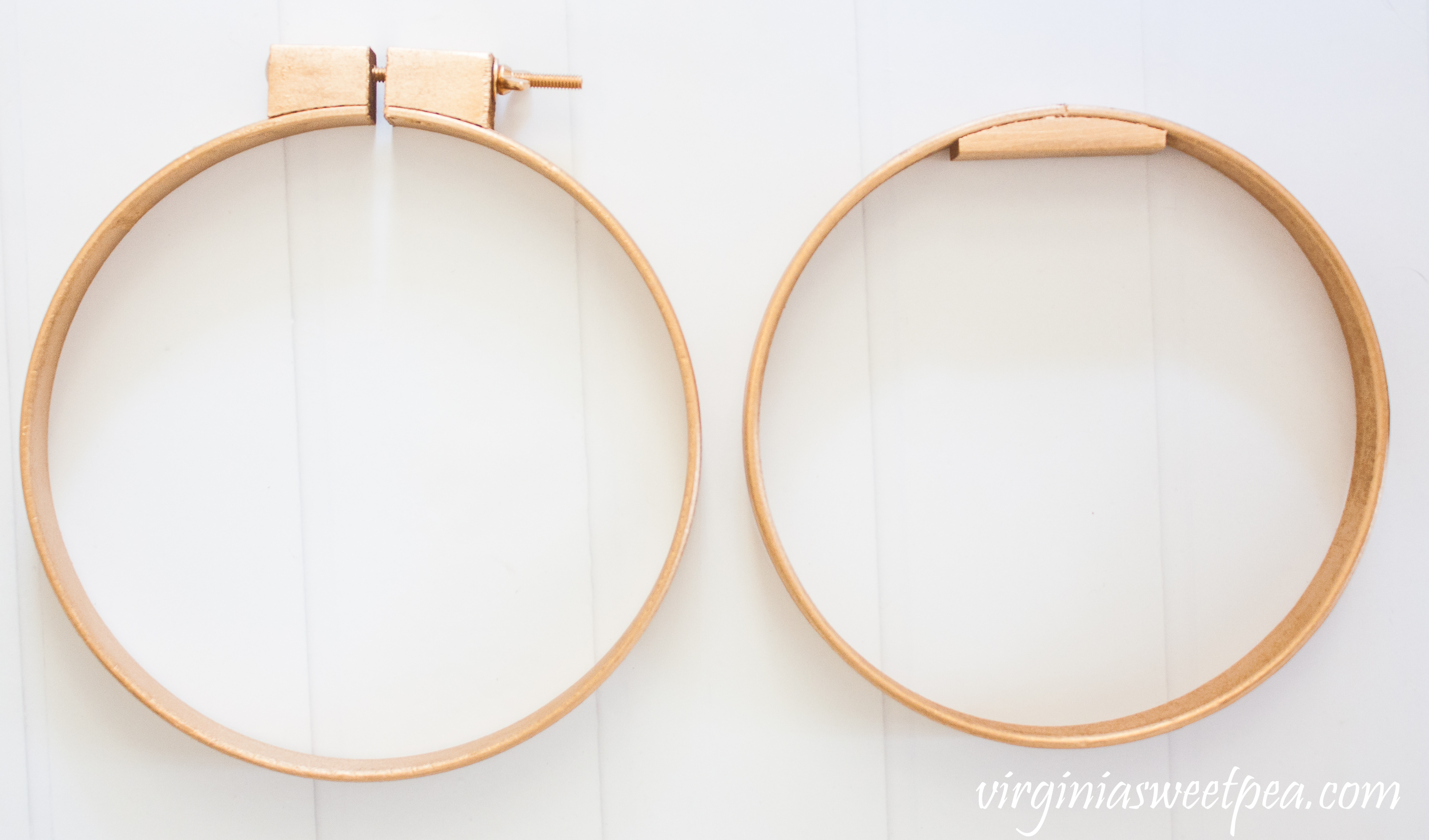 An embroidery hoop’s natural wood color makes a pretty base for a wreath. I chose to paint my embroidery hoop gold using spray paint that I had on-hand.