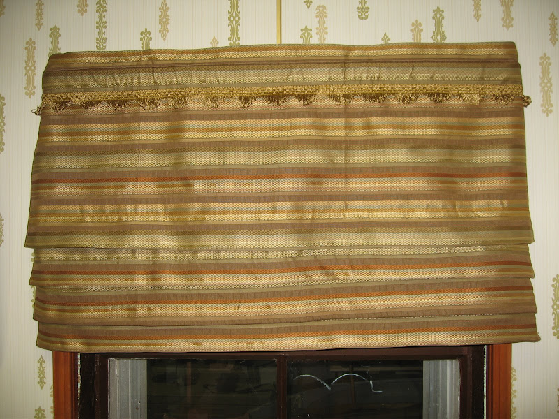 I decided to make a new curtain for this room with the goal being not to have to buy anything. I found a piece of fabric in my stash that blended well with the green and gold, lining, thread, and trim. All I needed was an idea and the time to make the curtain. I thought about what I wanted to do for a few days and finally got around to making the curtain. I do much better when I have a pattern with directions to follow, but this turned out pretty well.