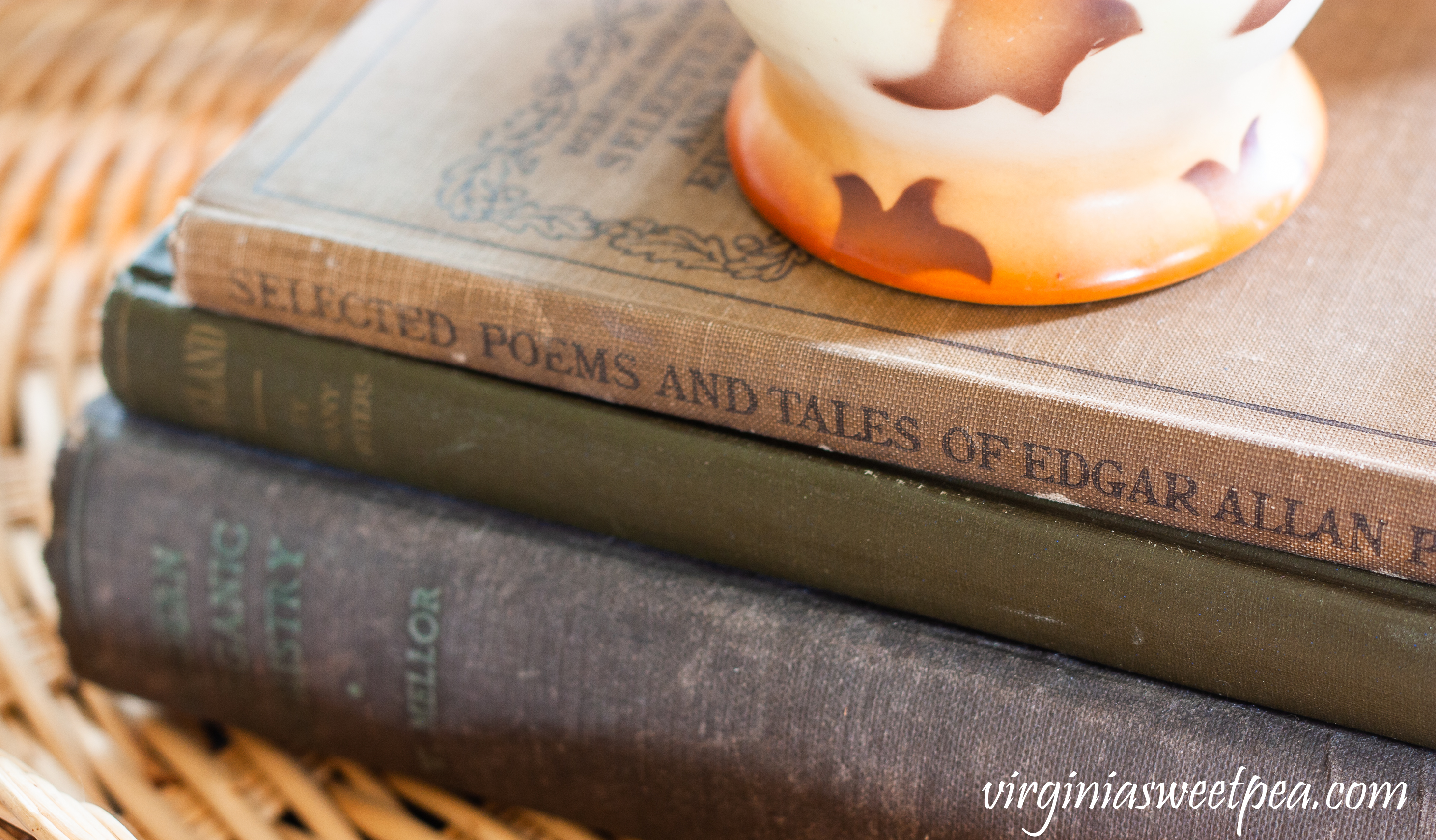 Yvonne added a stack of books topped with a Boxwood in a pot to her vignette.  Since I know Yvonne’s style quite well, I am pretty sure that her books are ones that she covered in burlap. I grabbed a few vintage books from a shelf to add to my vignette.1914 Edgar Allen Poe book, 1906 England book and a 1918 Modern Inorganic Chemistry book.