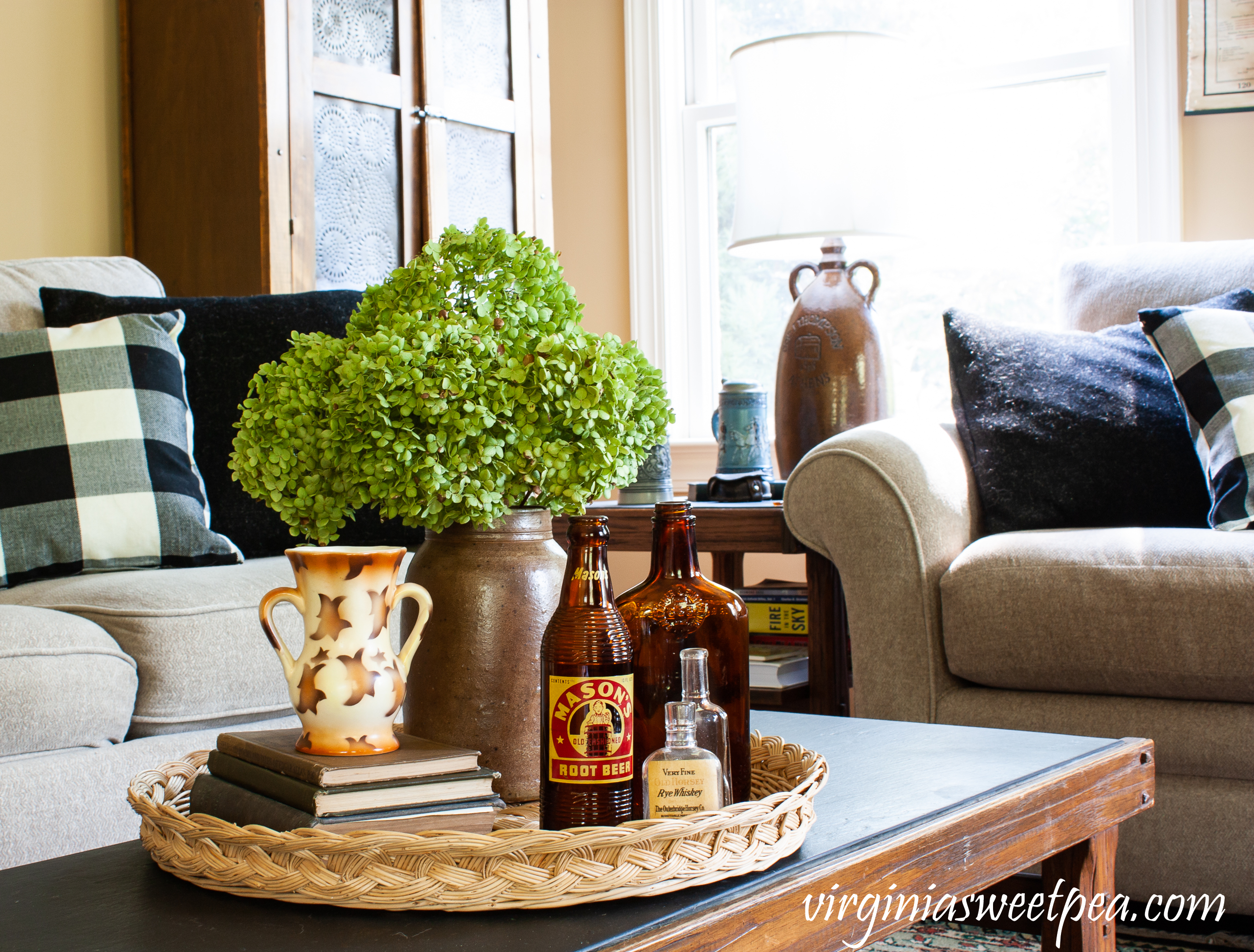 When I photographed my vignette from this angle, I removed one of the bottles.  I like the look better with two brown bottles, so I quickly replaced it.Early fall coffee table vignette with Hydrangeas in an antique crock, vintage bottles books, and a Czechoslovakian vase.