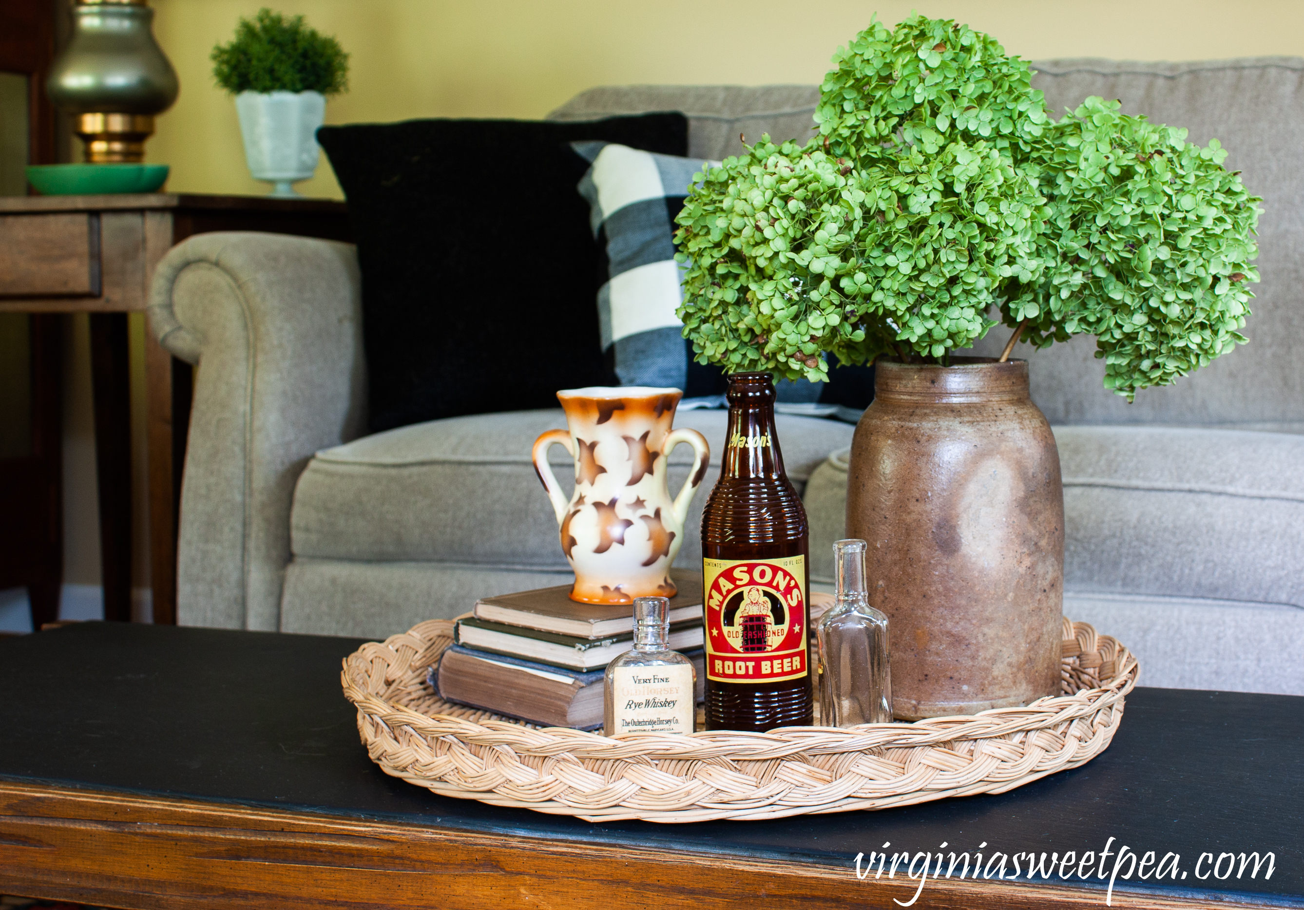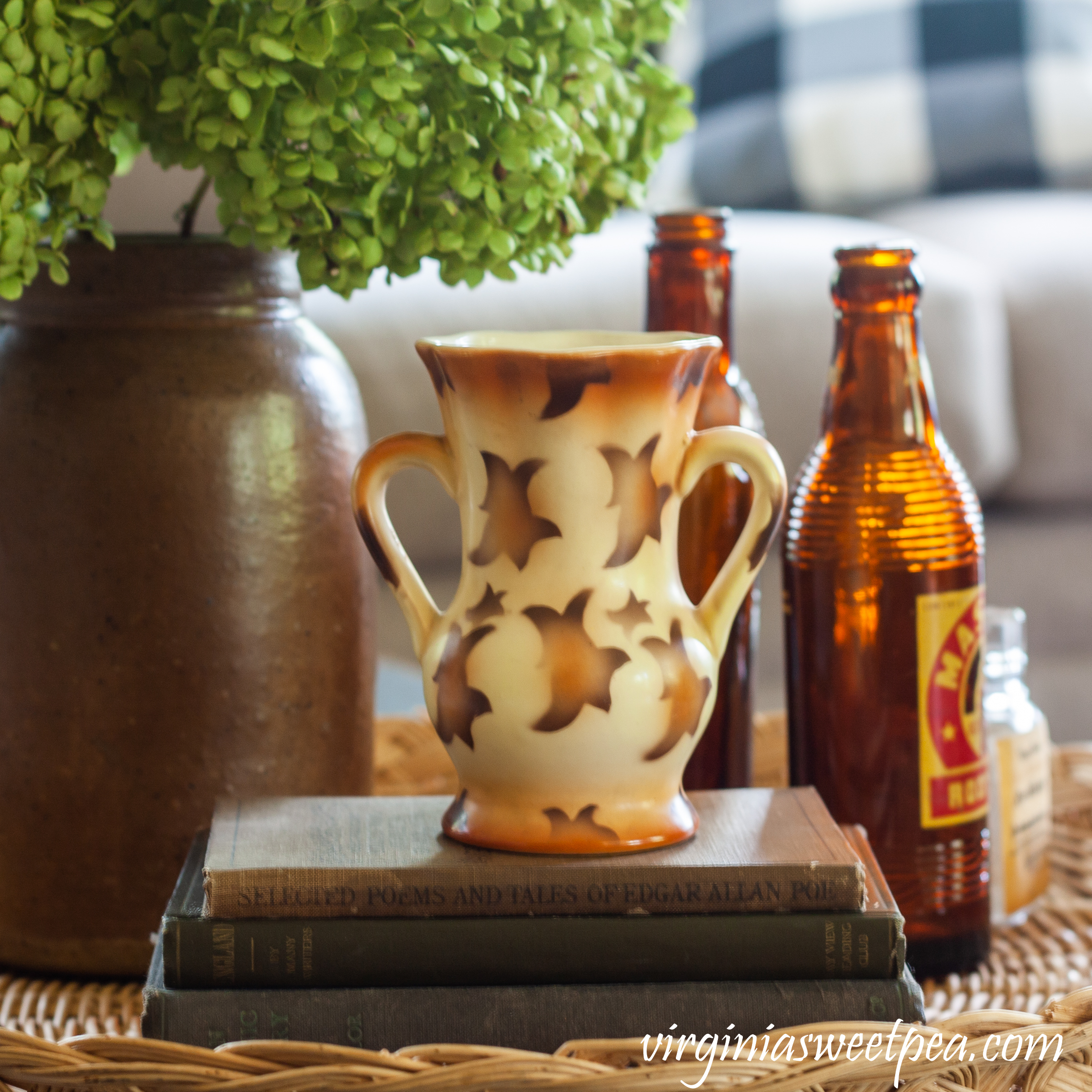 Yvonne used a vase of fresh Hydrangeas in her vignette which anchors the vignette with its size and height.  I clipped dried Hydrangeas from my yard and arranged them in an antique crock that I inherited from my grandmother.Early Fall coffee table vignette with Hydrangea in an antique crock, vintage bottles and books, and a vintage Czechoslovakian vase.