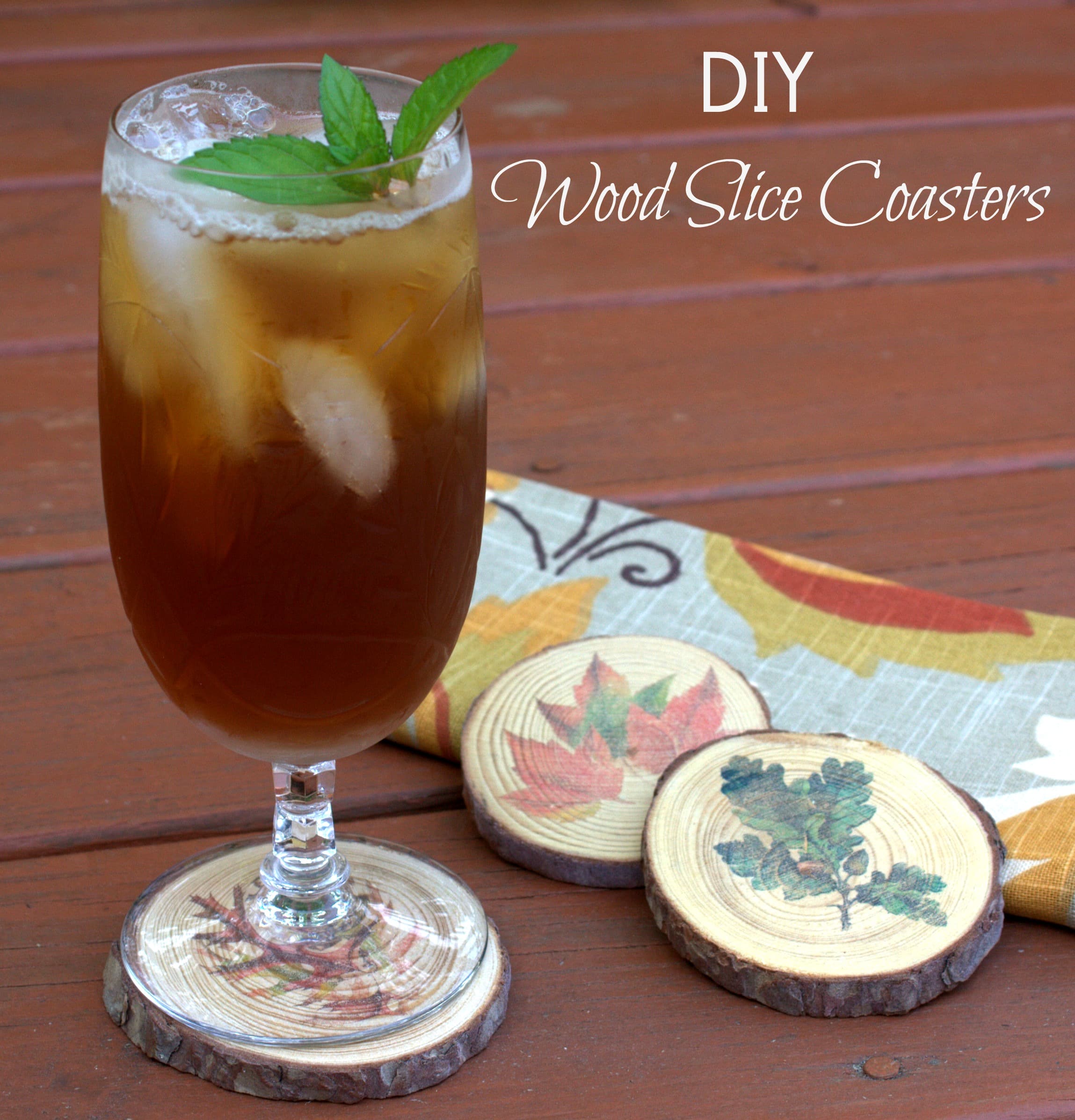 A made DIY Wood Slice Coasters with Fall Transfers. The images are transferred to the wood slices with wax paper. Be sure to check out this fun technique! These also look great with a hole drilled into the top for a twine hanger.