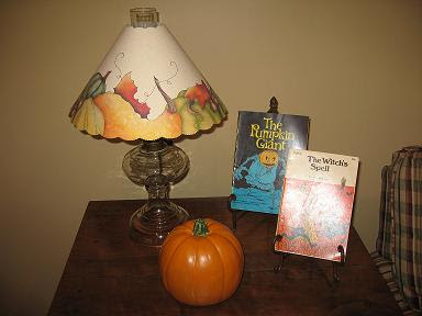 Just for fun, I put out some of my Halloween books from my childhood. I also have Clifford’s Halloween and Charlie Brown’s Great Pumpkin book. They are on another table. I love this lampshade. I got it in Staunton at a store that is no longer open.