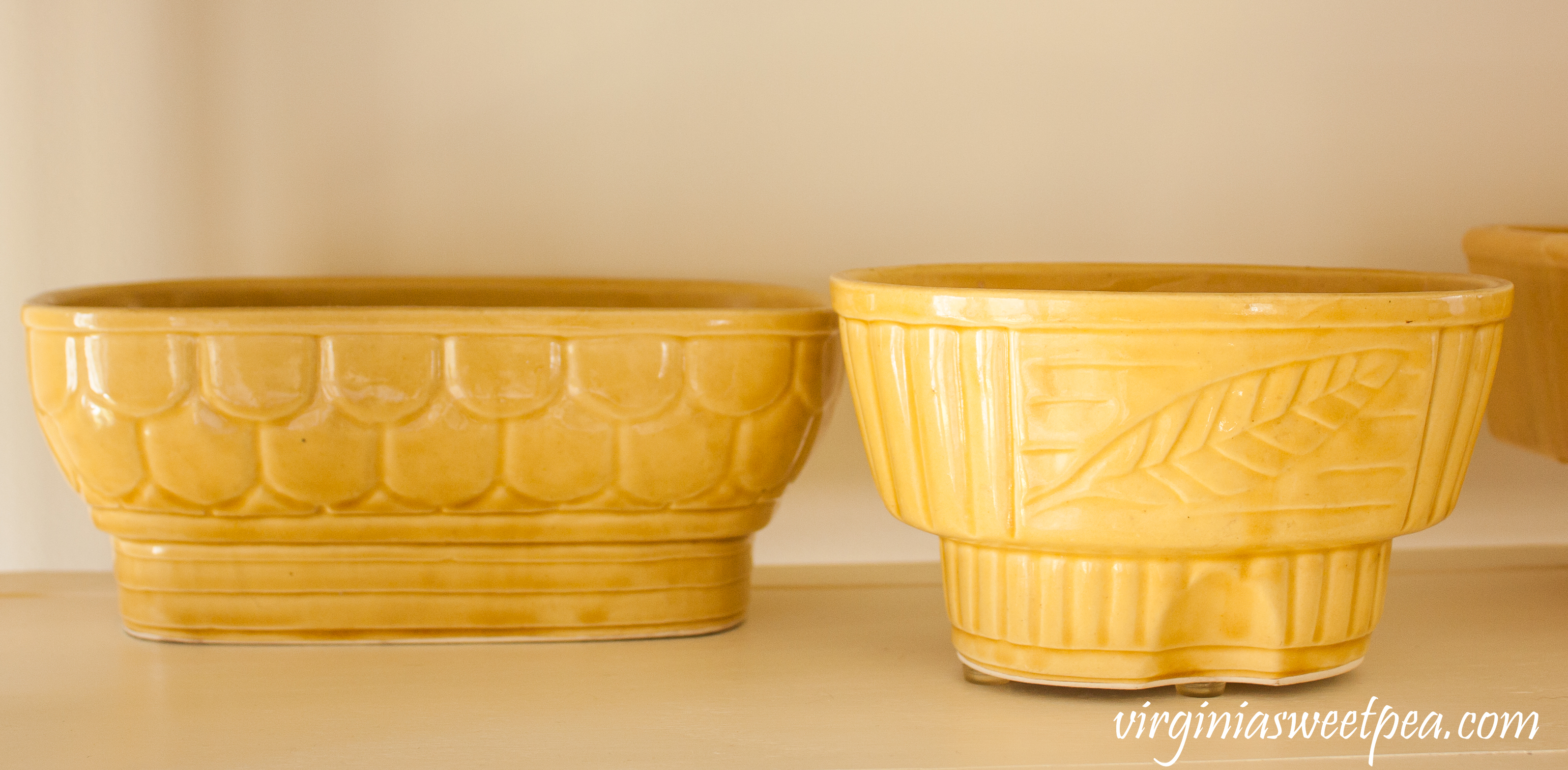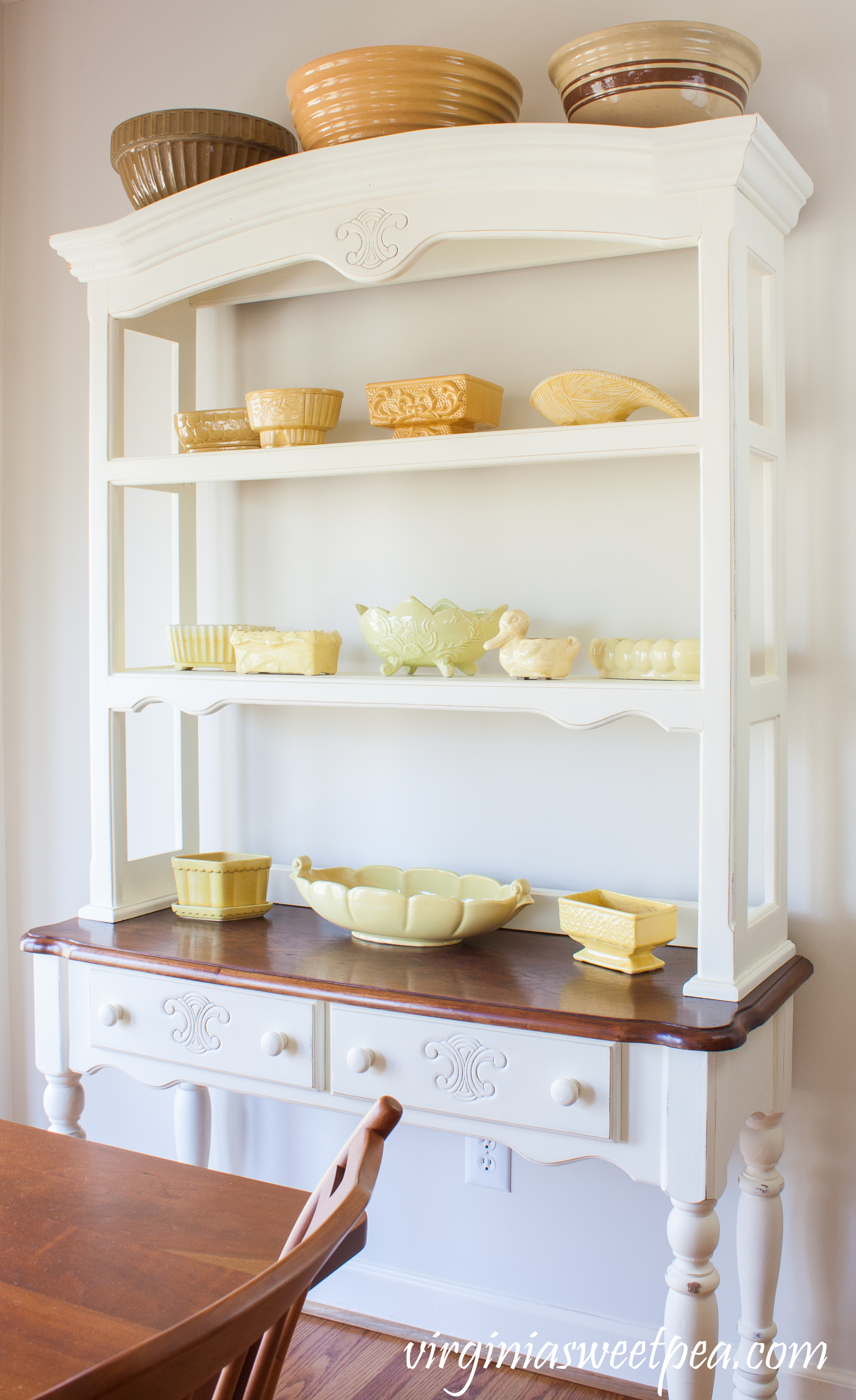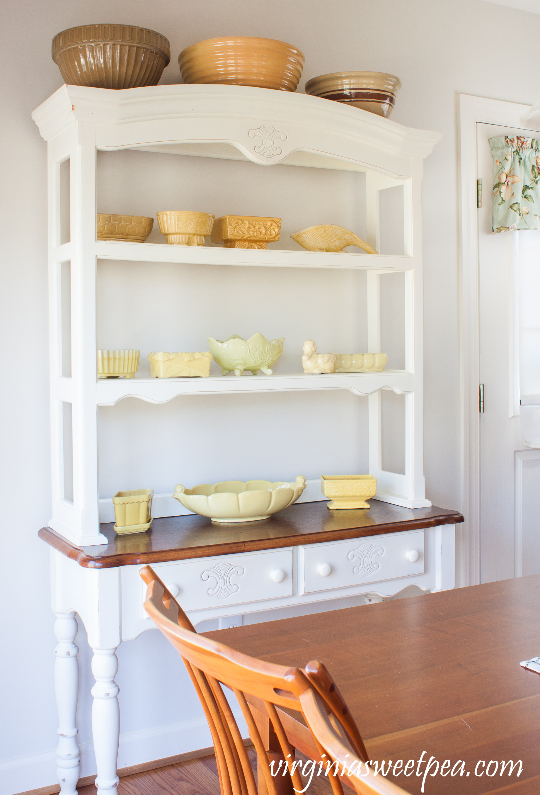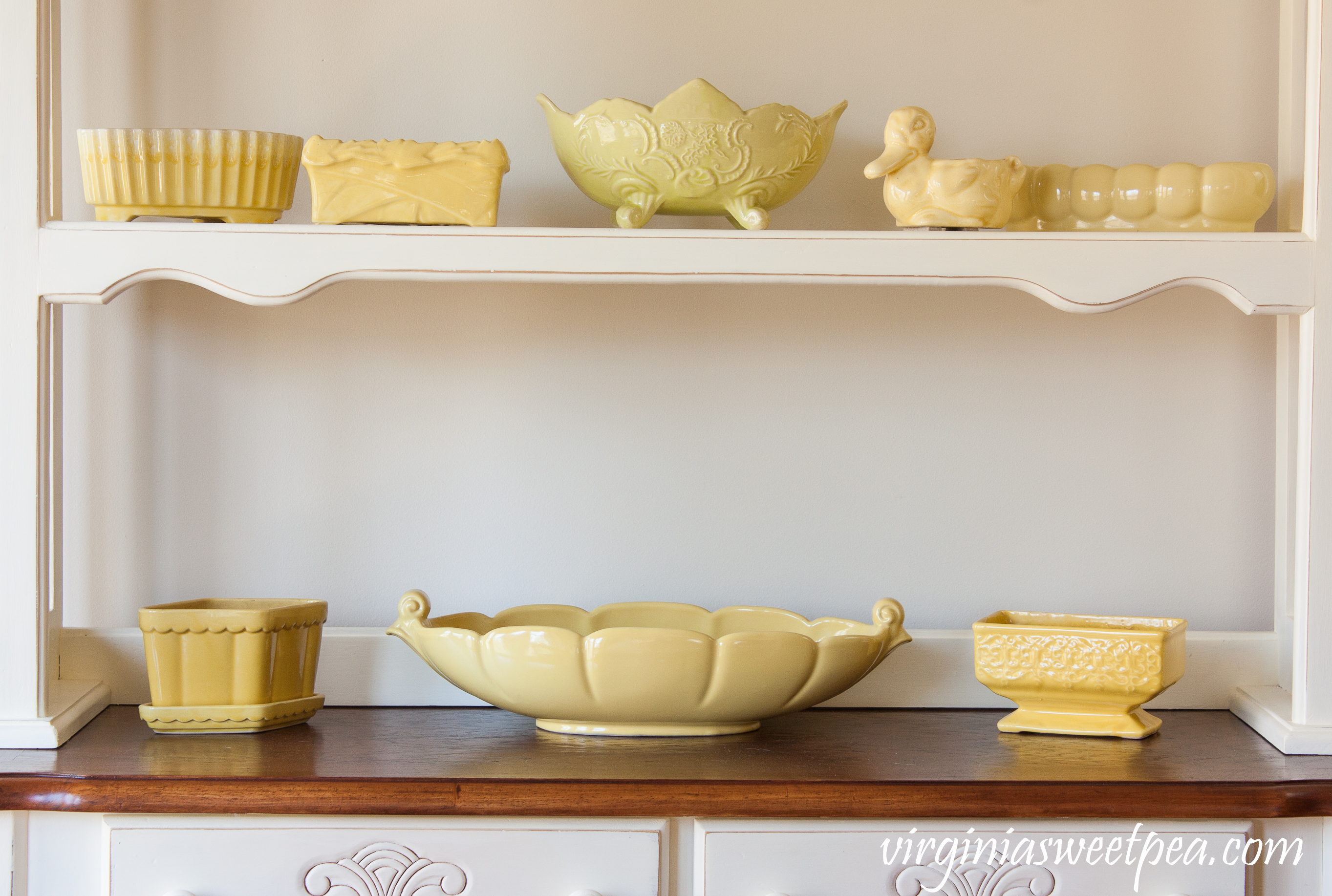 A few of these pieces belonged to my grandmother who was an avid gardener and garden club member. She arranged flowers for church and also for garden club competitions. Most of my yellow pottery collection along with the mixing bowls on top of the hutch were picked up here and there at antique shops and thrift stores.