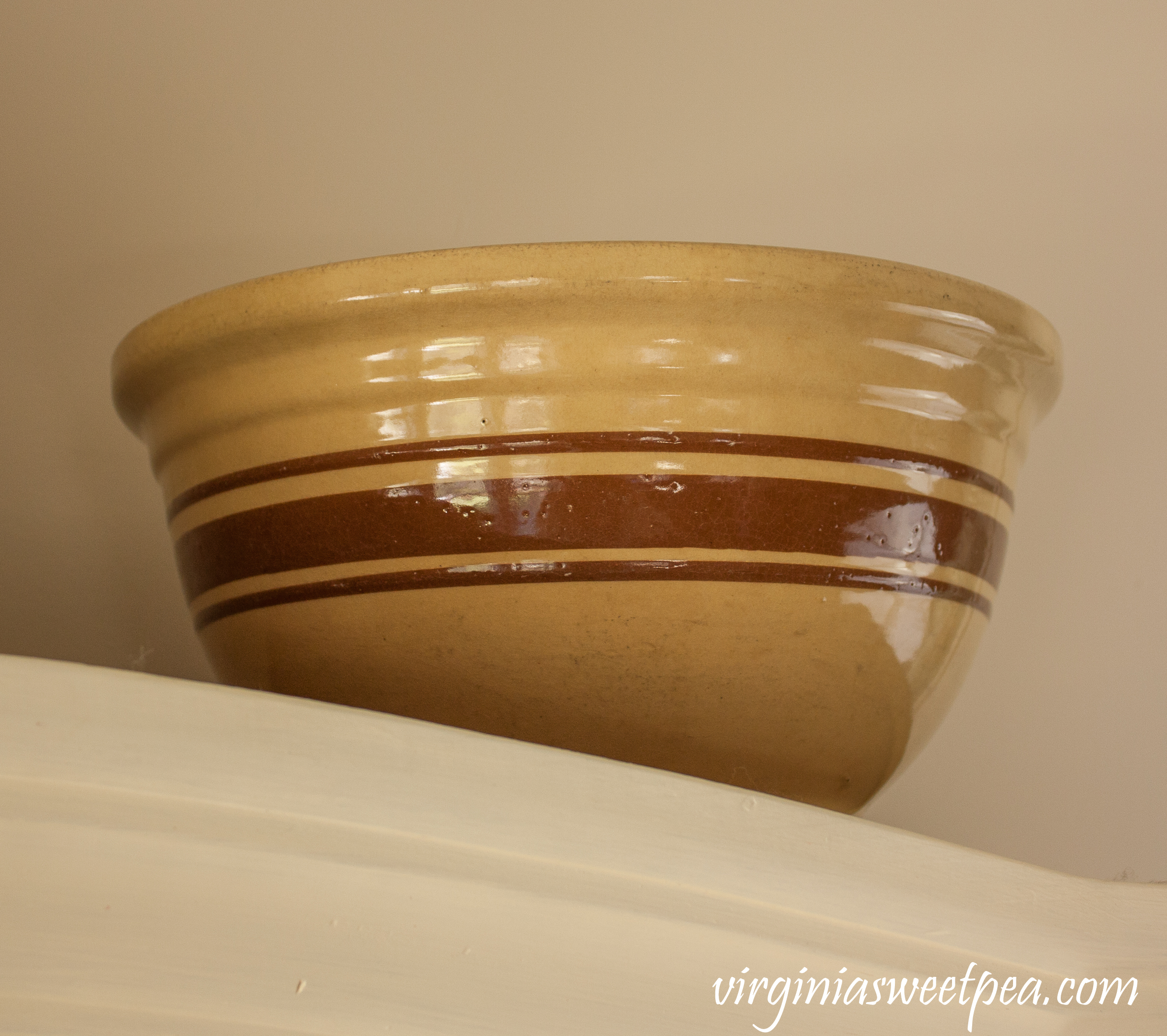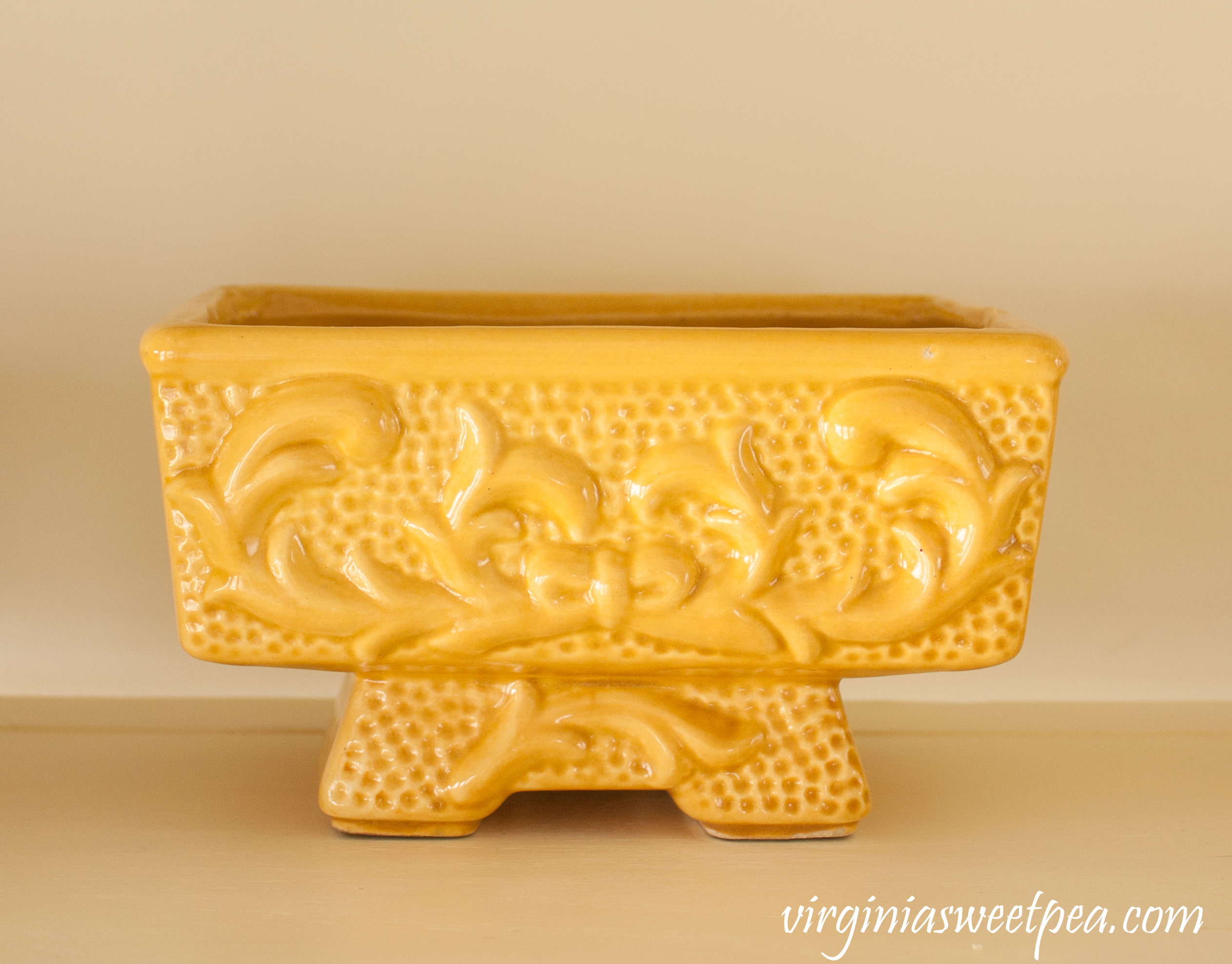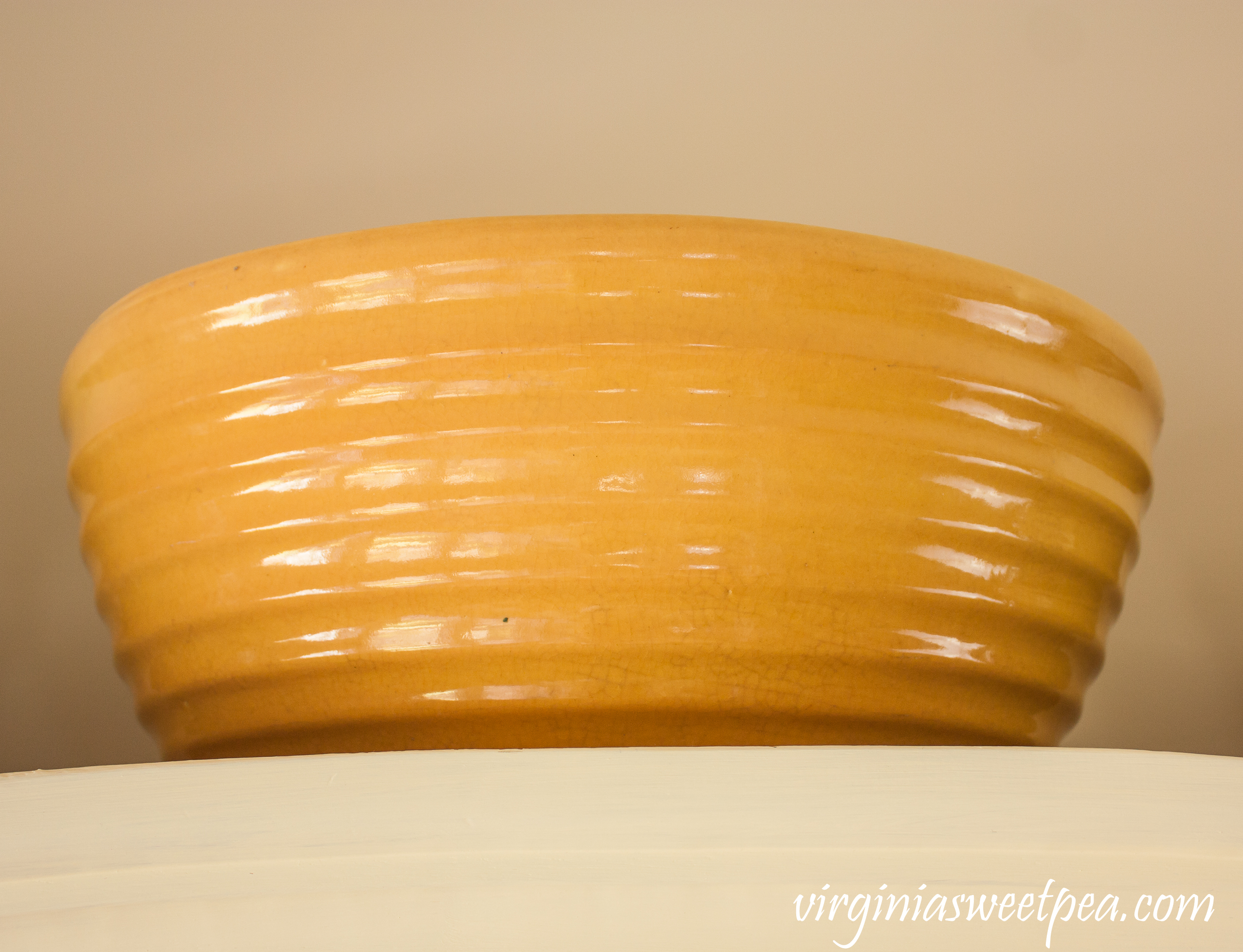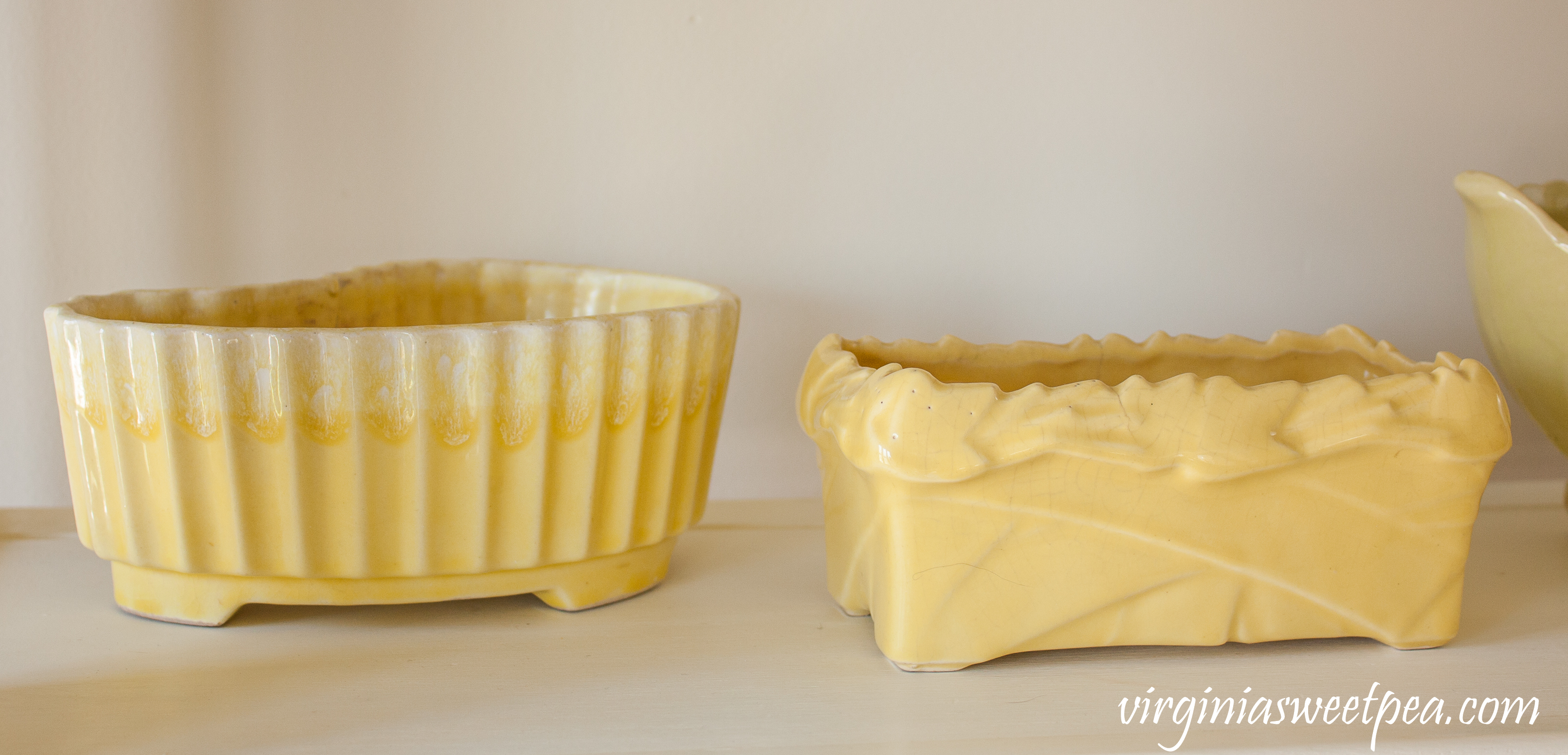 A few of these pieces belonged to my grandmother who was an avid gardener and garden club member. She arranged flowers for church and also for garden club competitions. Most of my yellow pottery collection along with the mixing bowls on top of the hutch were picked up here and there at antique shops and thrift stores.