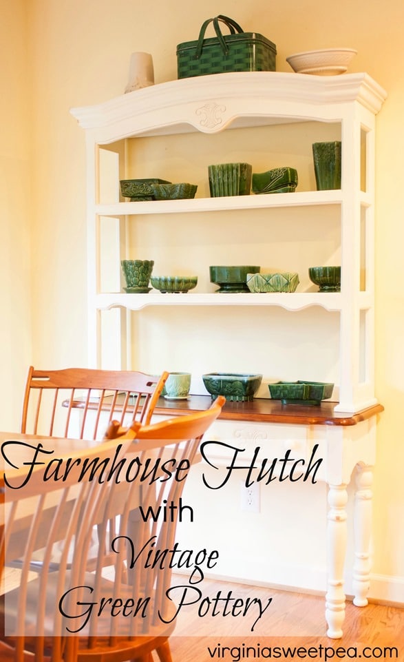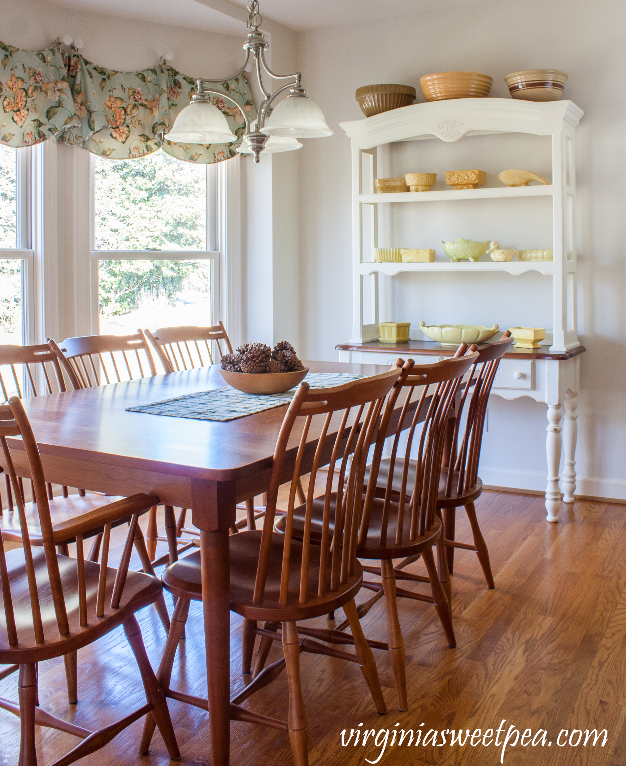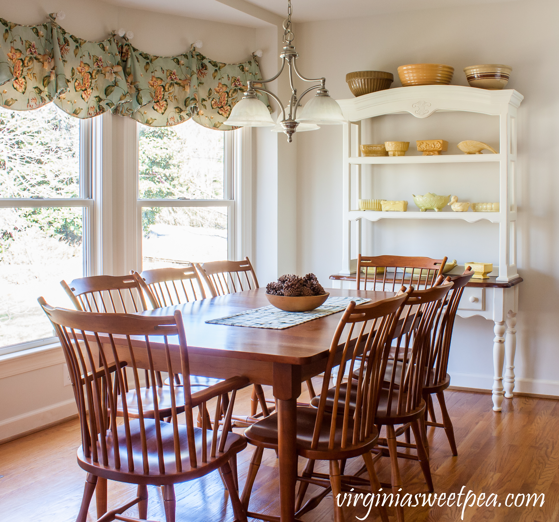 I love green and yellow so your hutch is a wonderful place to display your collections of green and yellow vintage pottery. I love your valance too. Did you make it?