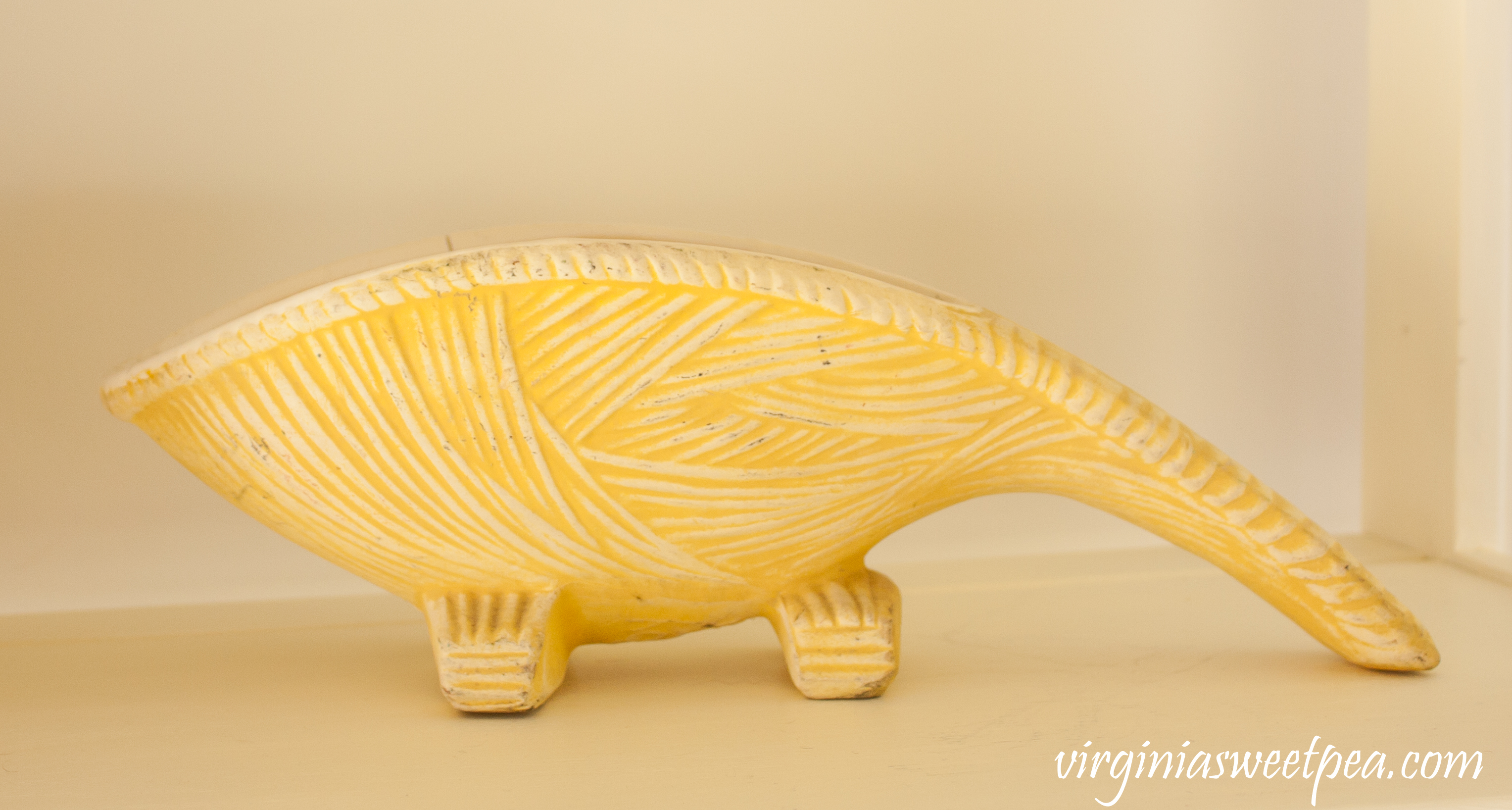 What a beautiful space, Paula! The yellow pieces look so bright and cheery! The “dinosaur” McCoy piece is circa 1959 and is a Basket Line Planting Dish.
